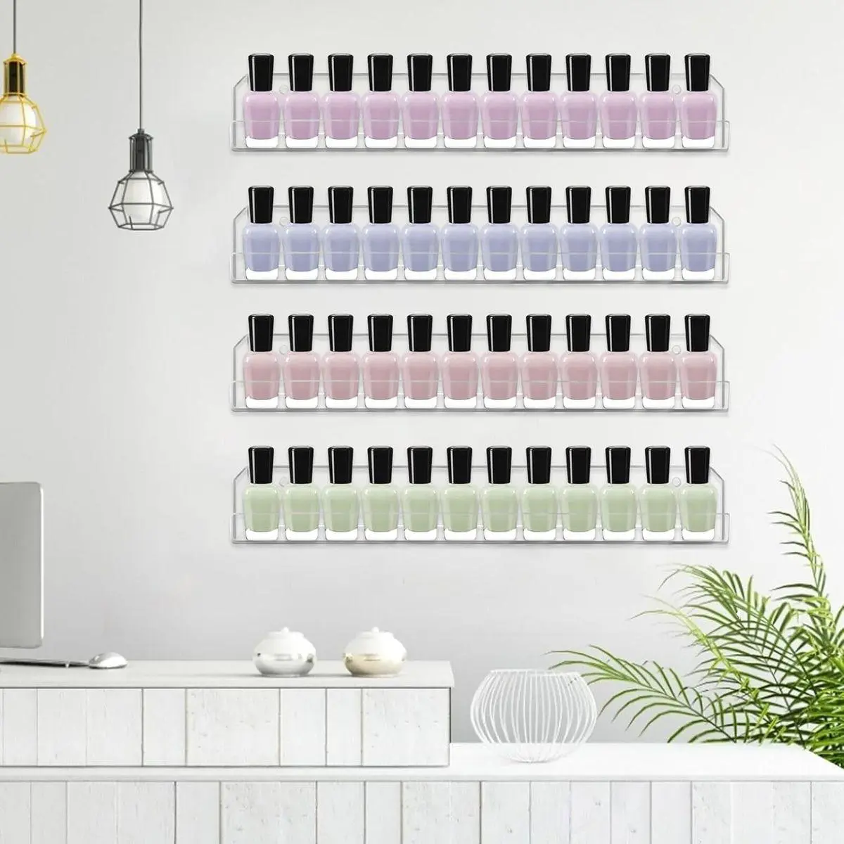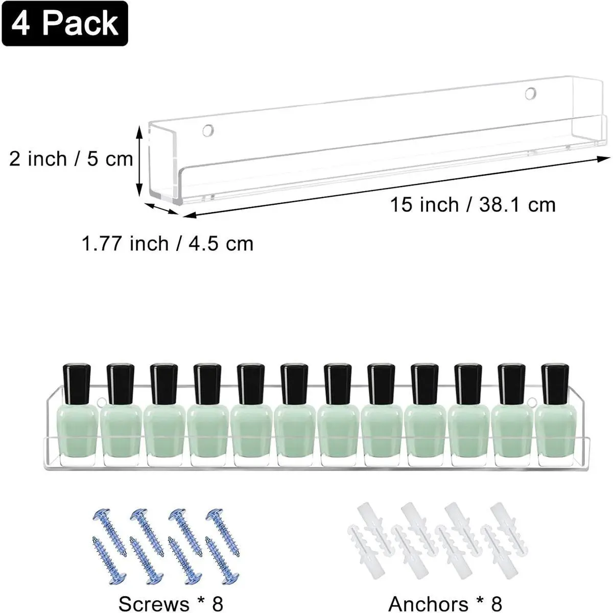 ✅THE PACKGE INCLUDES -4 pack 15"X2"X1.77" Nail Polish Rack Wall shelves come with mounting hardware, you need to drill a hole for the anchor prior to installation.