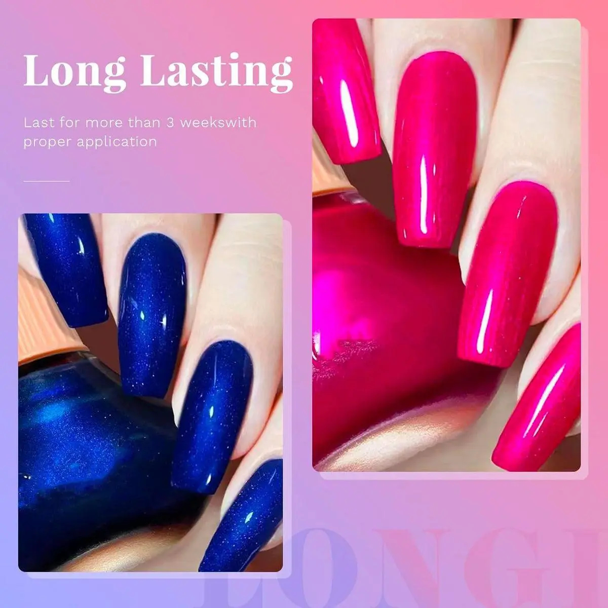 Nail Polish: 2 Pcs 12ml (0.41oz) Big Capacity Hot Pink and Blue Glitter nail polish, elegant shades of popular and trendy colors suitable for all seasons .Also suitable as a gift for Halloween, Thanksgiving, Christmas Holidays, special events, and daily routine life. It signifies confidence and elegance during any season or occasion!