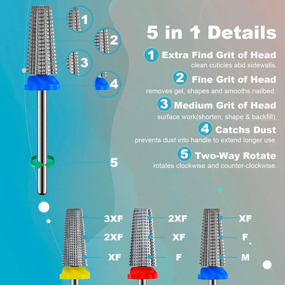 Multi-function 5-in-1 Drill Bit: The surface roughness of the acrylic nail drill changes from fine to thick from top to bottom. Can be used to clean, shape, cut, smooth, and remove
