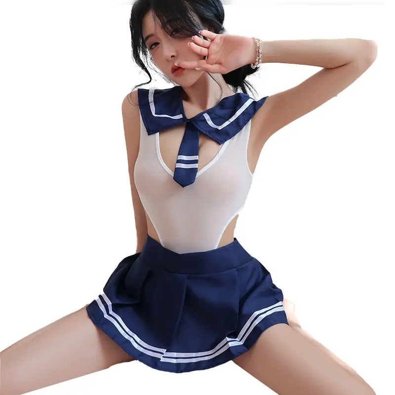 Sexy Schoolgirl Lingerie Set - Japanese Sailor Style Mesh Bodysuit & Pleated Mini Skirt 2-Piece Outfit for Women, Exotic Roleplay Nightwear