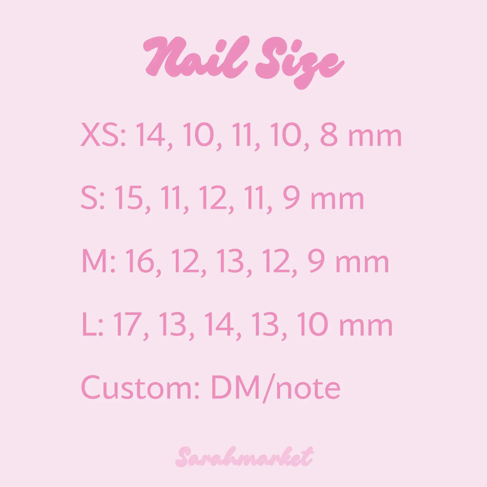 no two sets will ever be exactly the same. maybe a tiny brush stroke is a little different, or a charm sits slightly unique — that’s what makes your set yours only. i always try my best to match the photos as closely as possible, while keeping the beauty of handmade art. when you order from me, you’re not just buying nails… you’re supporting a small artist who truly puts her heart into every set. and that means the world to me.