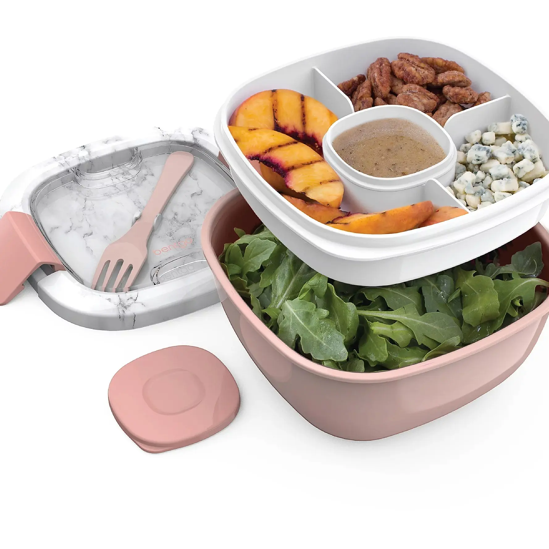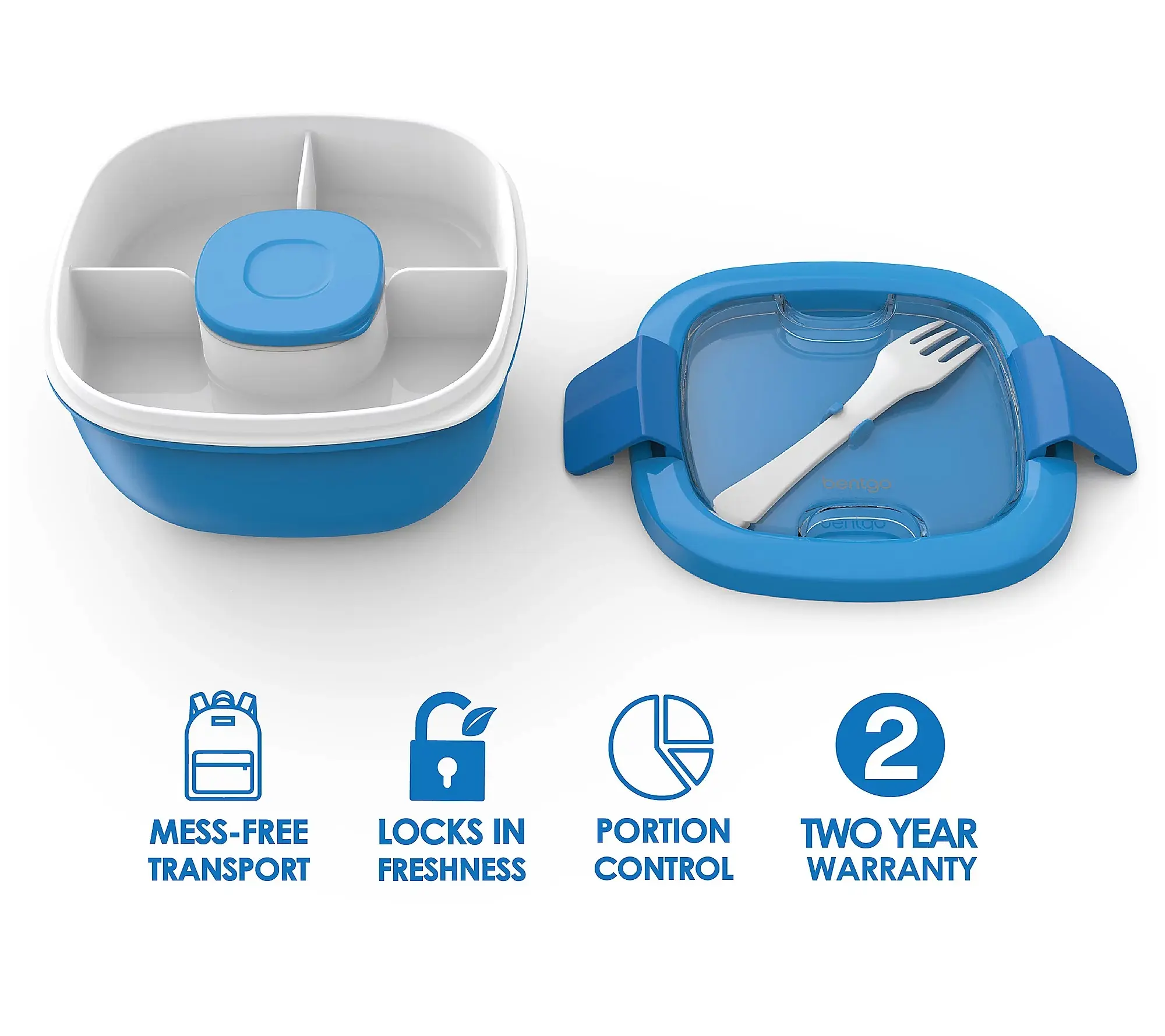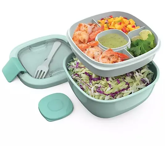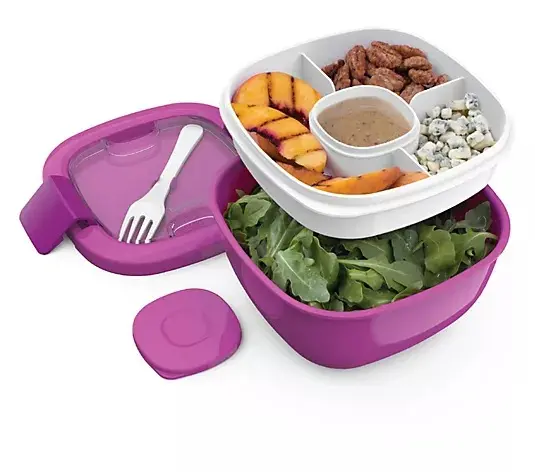 Includes a large 54 oz bowl, removable tray, 3 oz dressing container, built-in fork, and utensil cover for ultimate convenience.