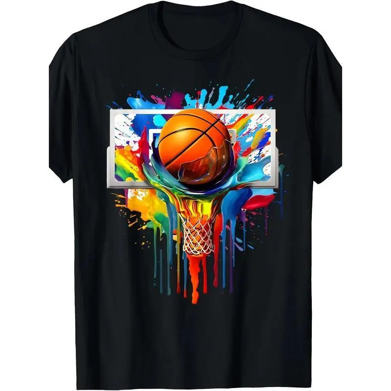 Men's Basketball Dunk Tie-Dye Splash Print Cotton Tee - Black Casual Round Neck, Machine Washable, Summer Fashion Statement