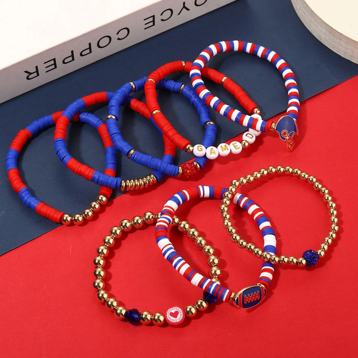 Features football team colored disc clay beads, 'GAME DAY’ lettering, football charms, helmet charms and jersey charms strung on elastic bands