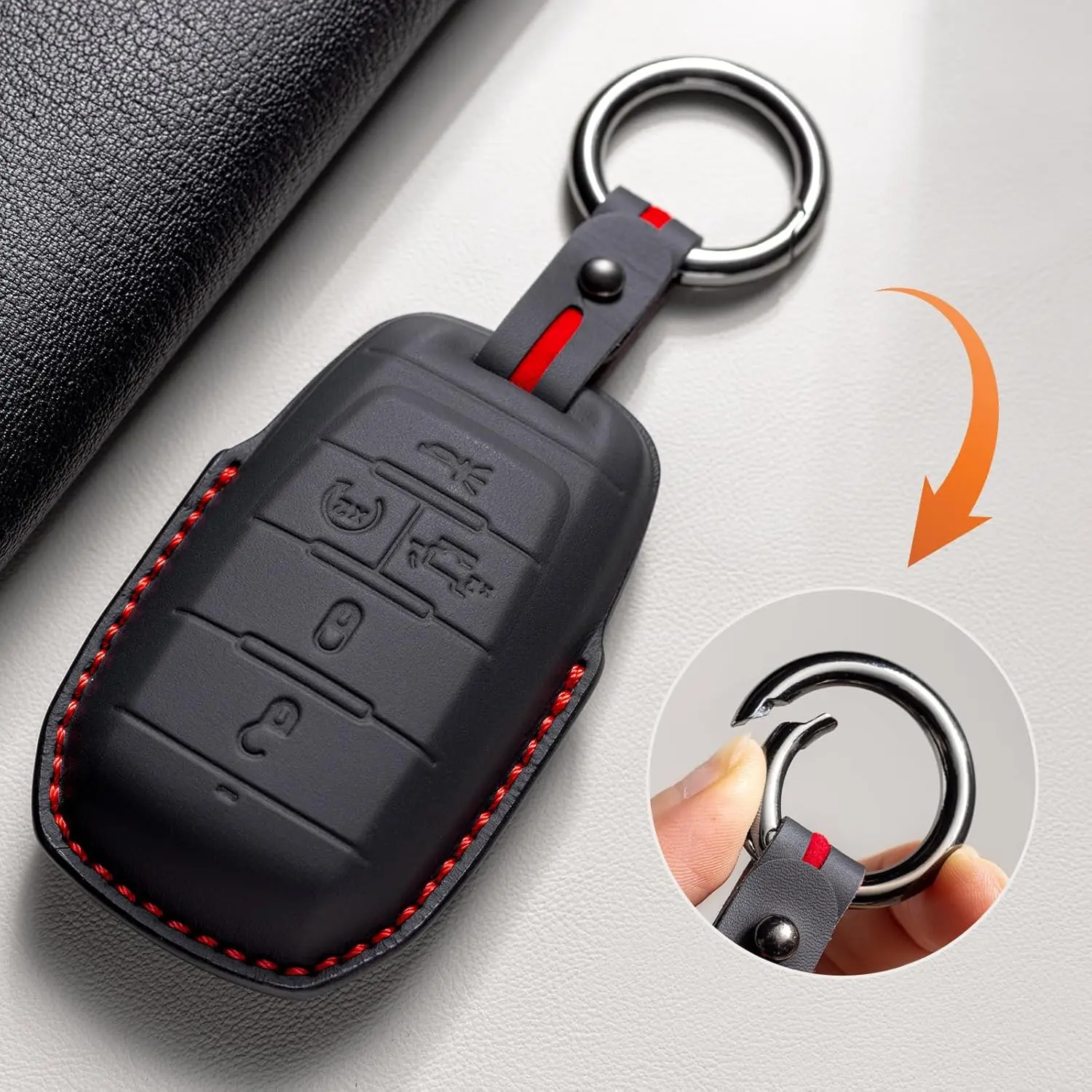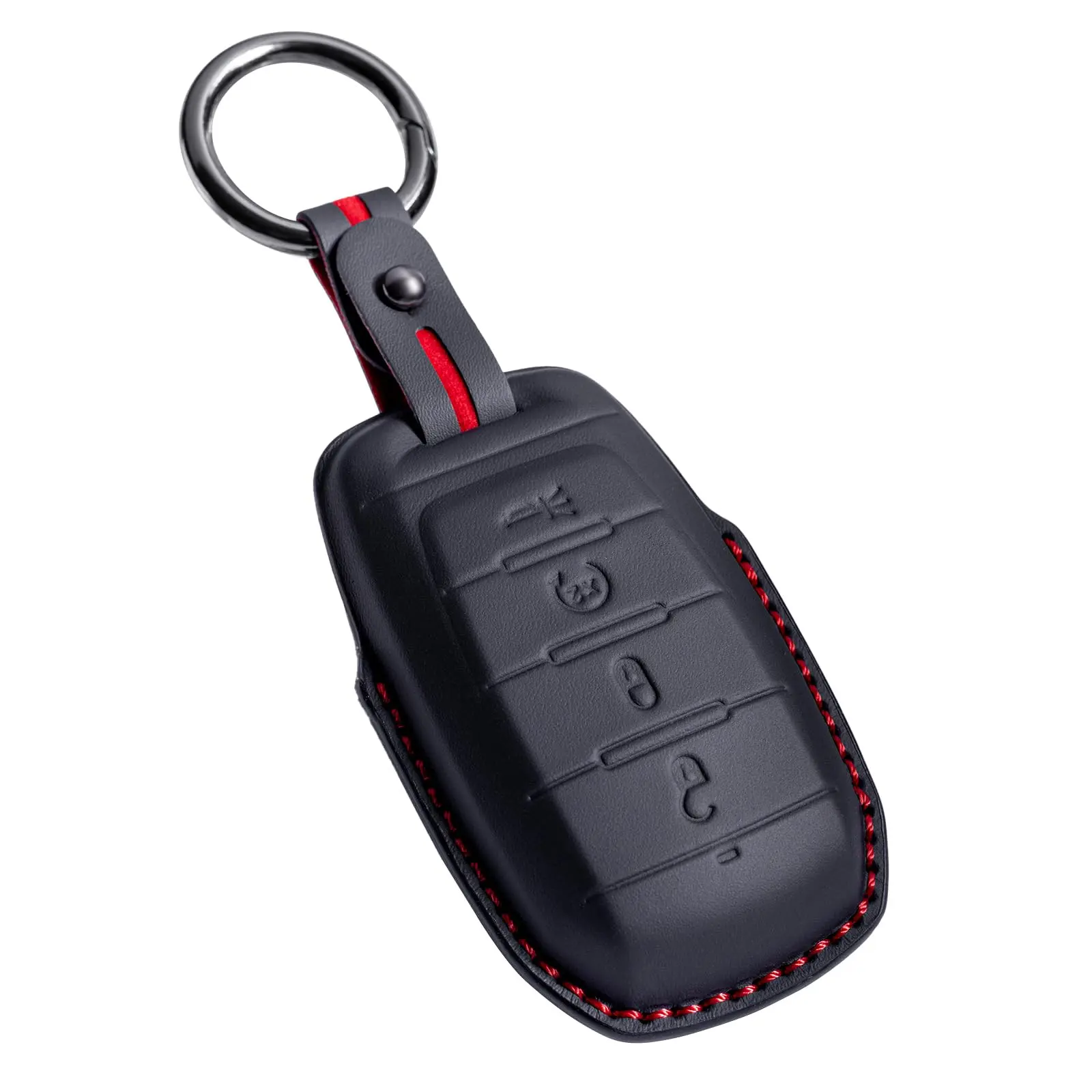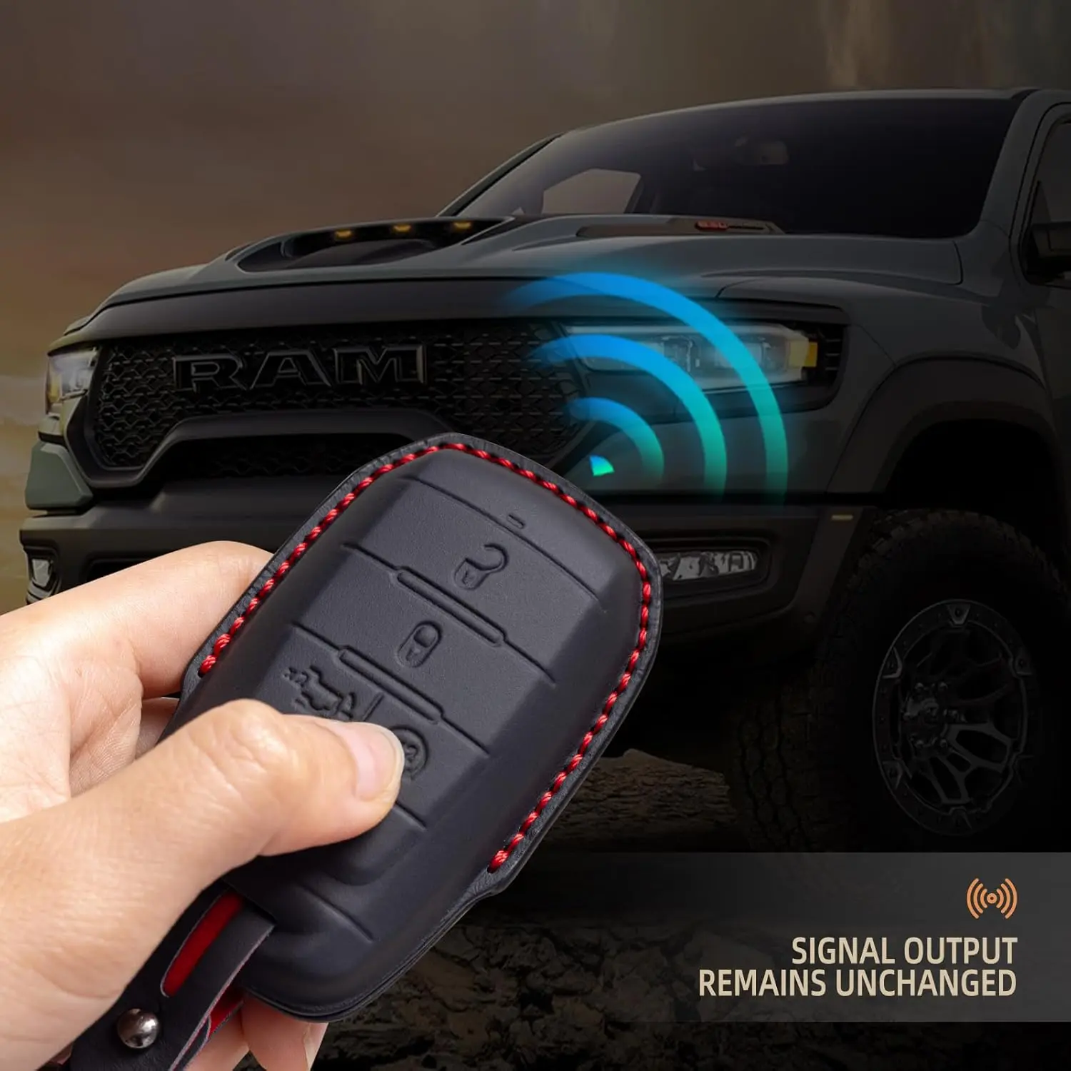 Protect your Compatible with Dodge RAM key fob in style with this premium genuine leather key case cover. Specifically designed for RAM1500, 2500, 3500, 4500, and 5500 models from 2019 to 2025, this sophisticated cover provides a perfect fit for your keyless entry remote. The smart key case features precise cutouts that ensure all buttons remain fully accessible and functional. The included leather key strap adds convenience while enhancing the overall aesthetic appeal. This durable cover not only shields your key fob from daily wear and tear but also adds a touch of luxury to your vehicle's key set. The genuine leather construction offers a comfortable grip and develops a beautiful patina over time. Keep your expensive key fob protected while maintaining its sleek appearance with this expertly crafted leather case cover.
