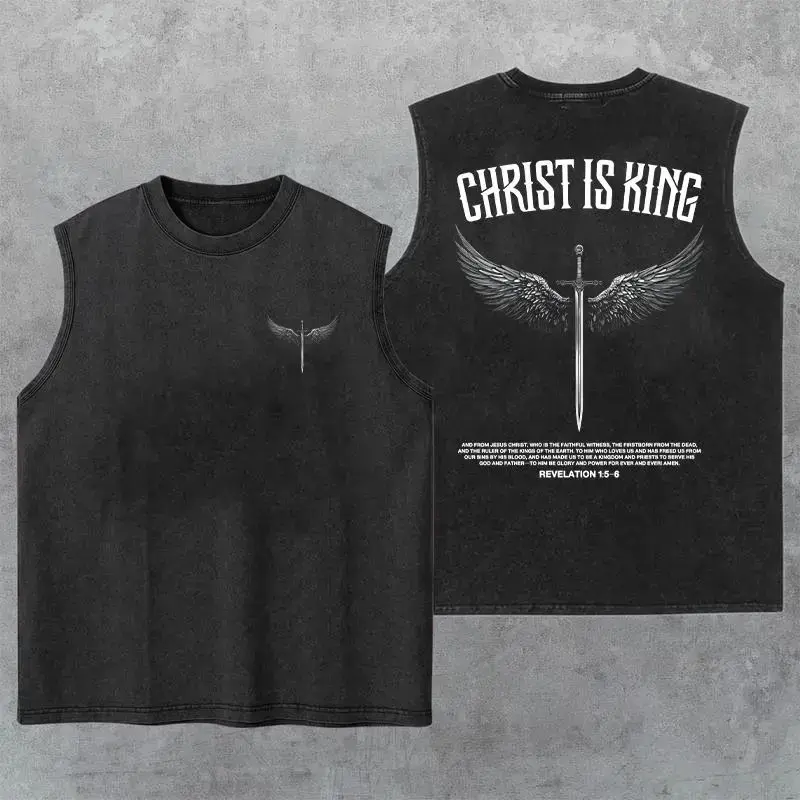 5. Christ Is King Washed Tank Top, Gym Essential, Vintage Casual Crewneck Short Sleeves Menswear T-shirt Classic Cotton Fabric Streetwear