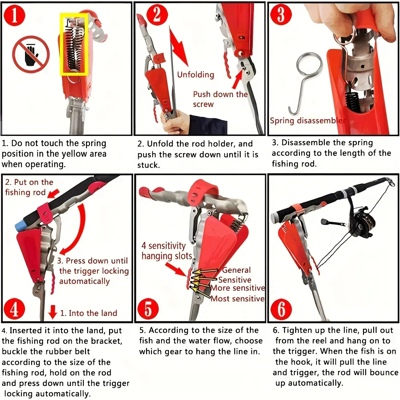 ·[Super Automatic Design]The fishing rod holder with single spring loading automatically sets your hook. The line trigger will activate the prompt only when the fish is hooked. Ultra-sensitive, 4-level sensitivity adjustable, low and high spring tension adjustable, help you catch small or big fish easily