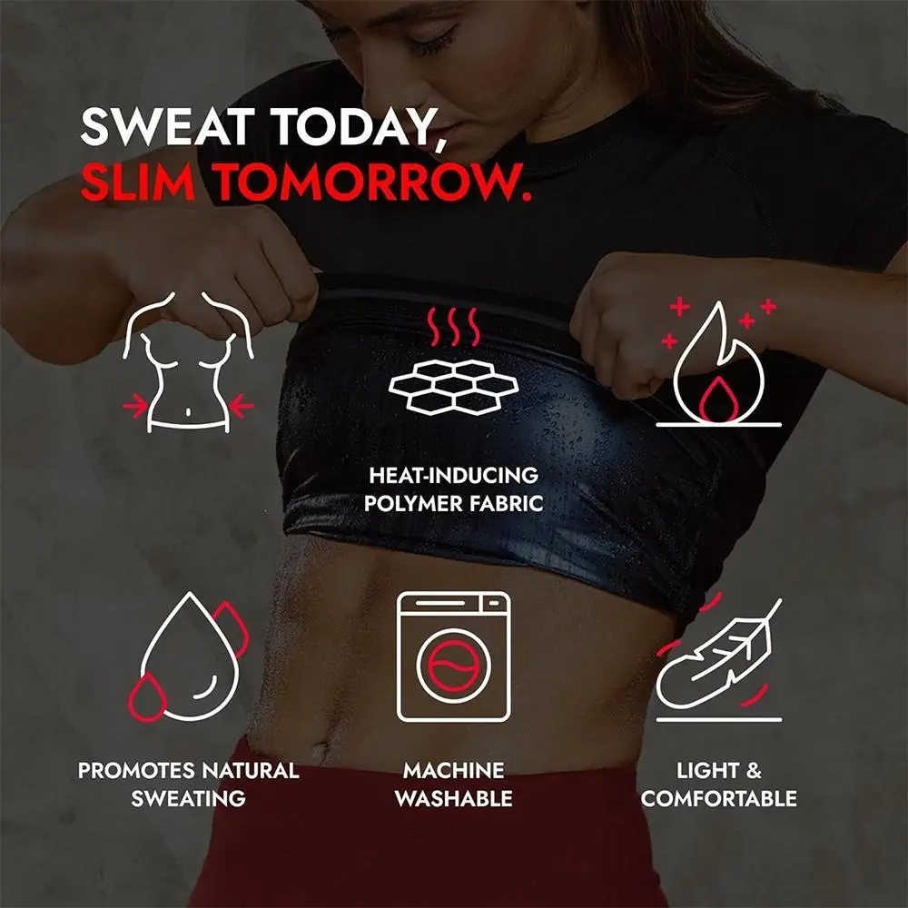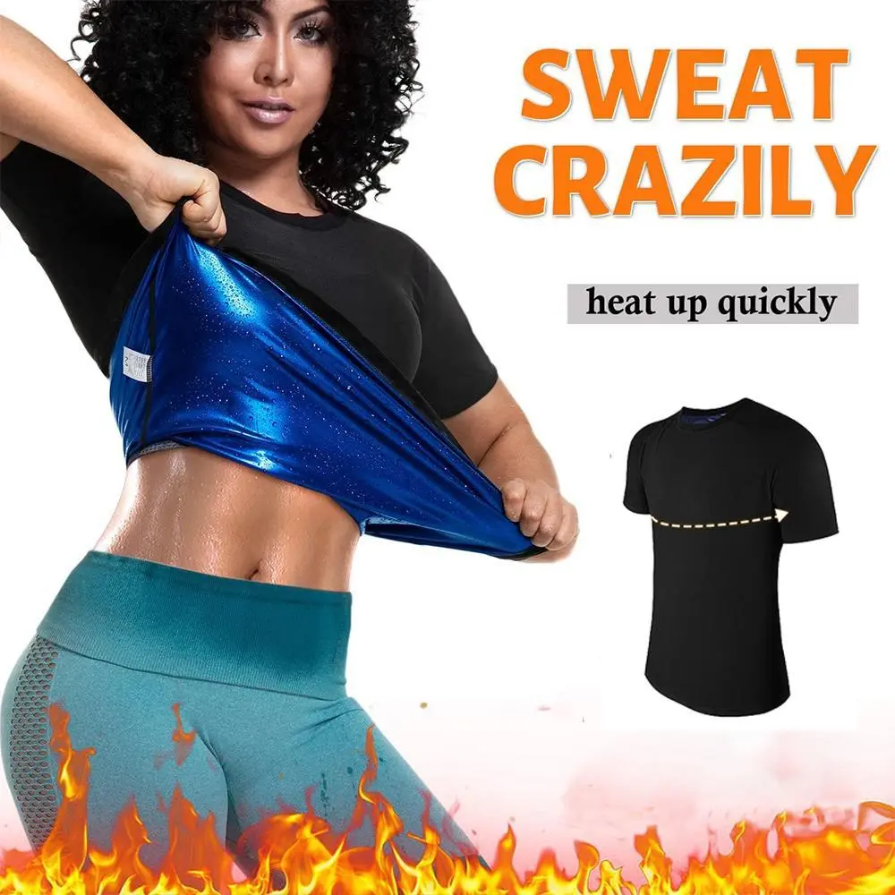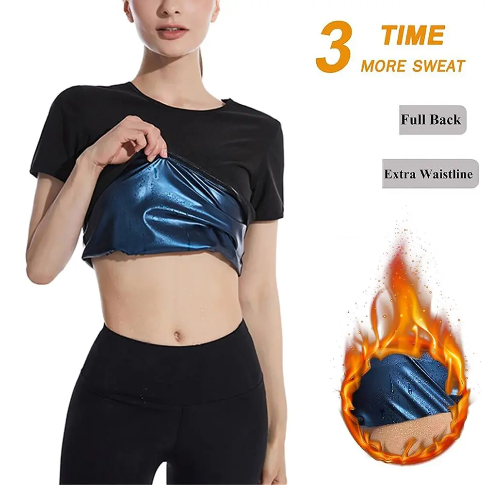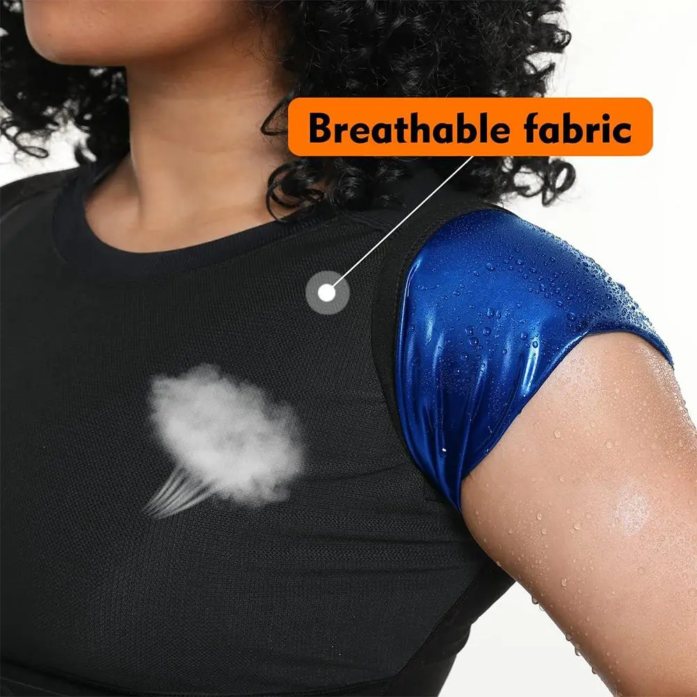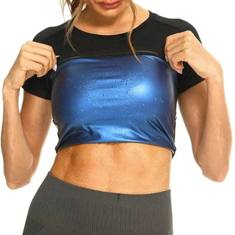 This sauna suit is designed for women. It includes a short sleeve sweater and an athletic tee. The sauna top features a compression waist trainer. Ideal for those seeking a versatile workout outfit.