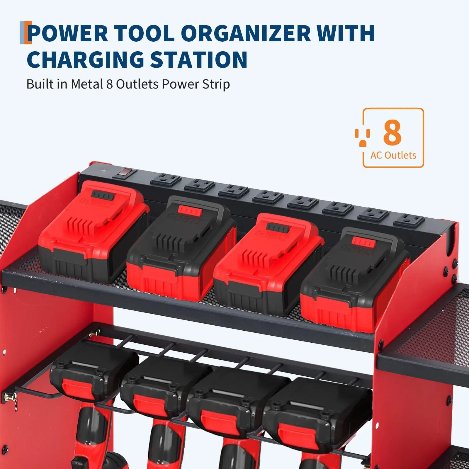 Convenient charging tool: The power tool organizer with a charging station is equipped with an 8-hole power strip, a 5.5-foot 14AWG power cord, and an output of 125V/15A/1875W. The power strip is installed on a grid rack to save workbench space and is easy to plug and unplug. It has 1200J protection, which can protect your equipment to a certain extent. Practical stand dimensions: 39.13*8.66*16.54 inches. If you have many rechargeable tools, you can charge them on the she shelf.