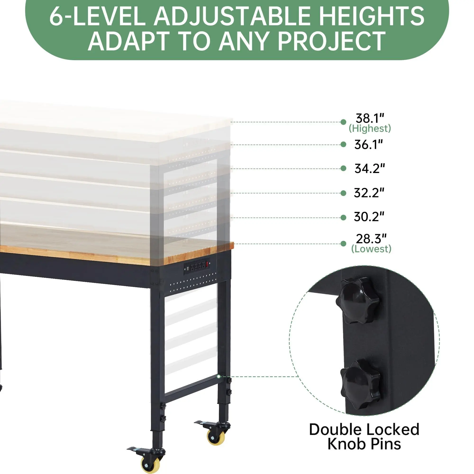 5. 48"X24" Adjustable Rolling Workbench, with Power Outlets, Wheels, 2000 LBS Load Capacity Heavy-Duty Workstation, Wooden Tool Bench for Garage or Workshop