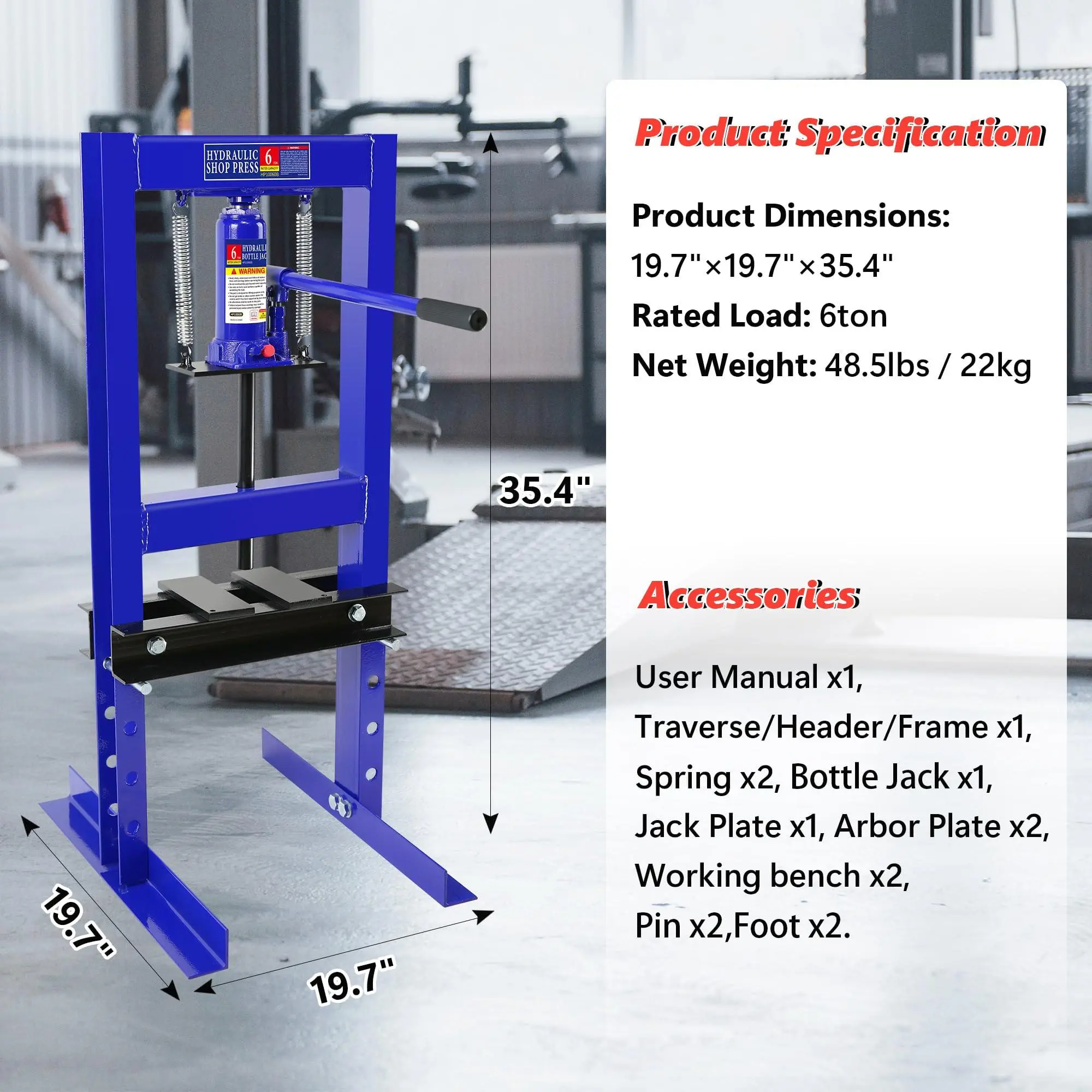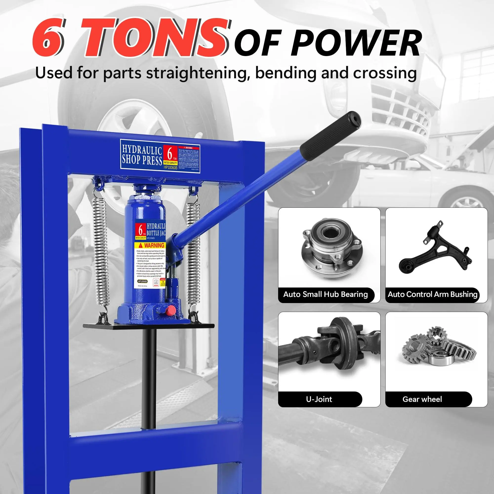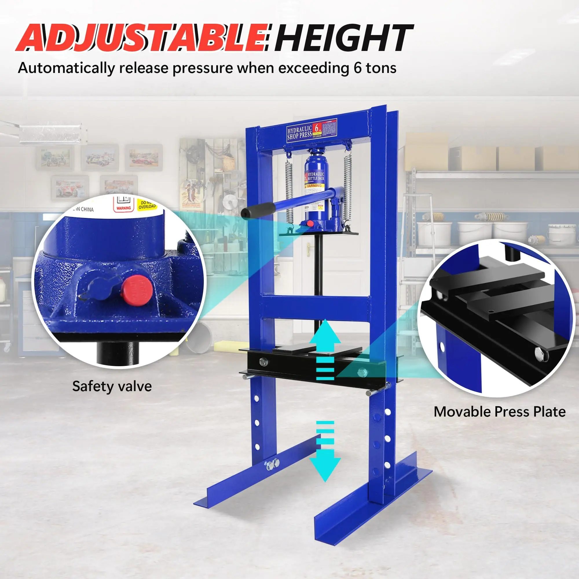 5. Blue Hydraulic Shop Press,6 Ton H-Frame Garage Floor Adjustable Shop Bearing Press with Stamping Plates to Bend, Straighten, Or Press Parts, Install Bearings & U-Joints
