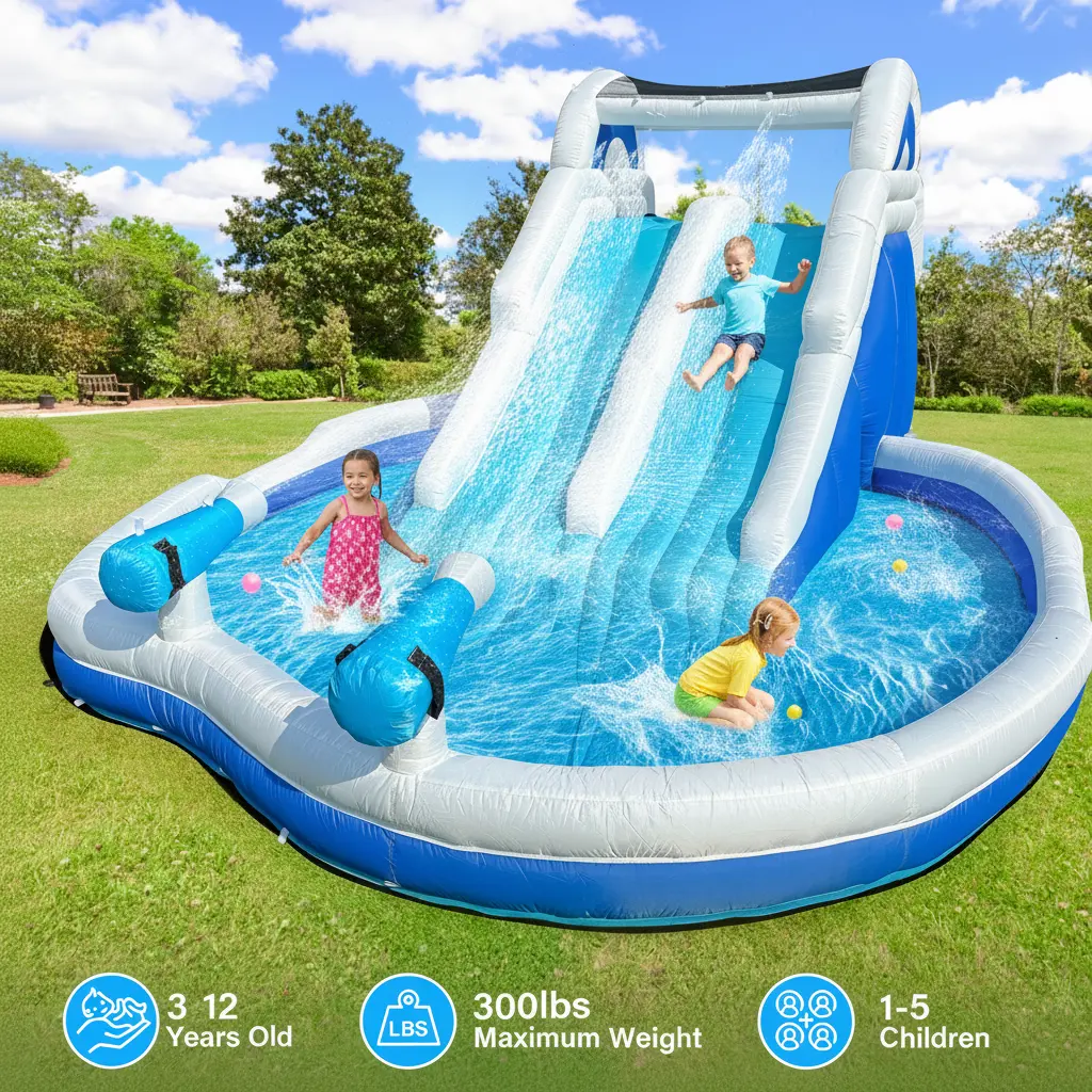 ·Versatile Water Park Design:outer new inflatable double water slide, climbing wall, and a spacious splash pool. Constructed from durable Oxford cloth, it comes equipped with two water cannon and water pipe, allowing both children and adults to enjoy active outdoor water play.