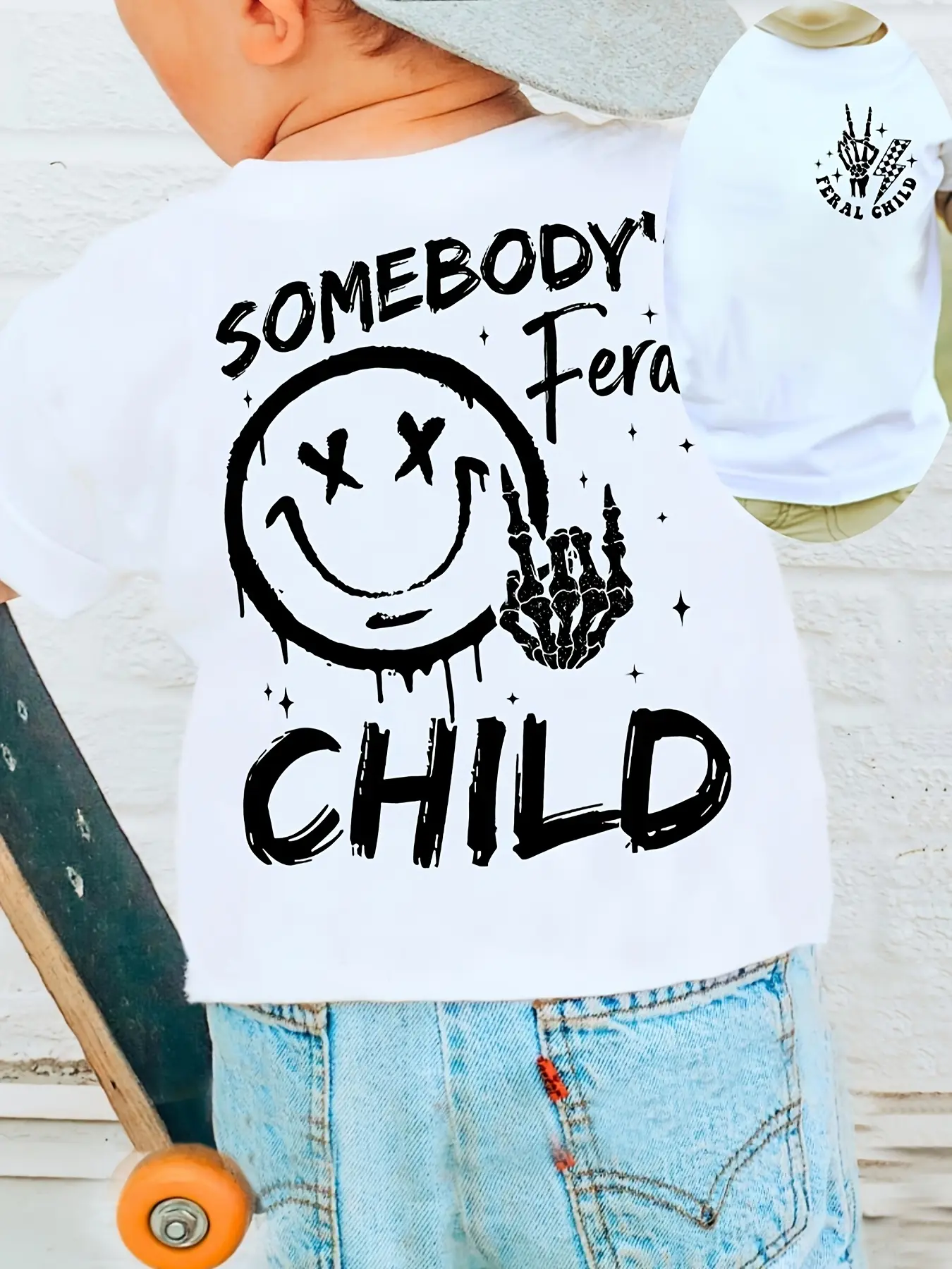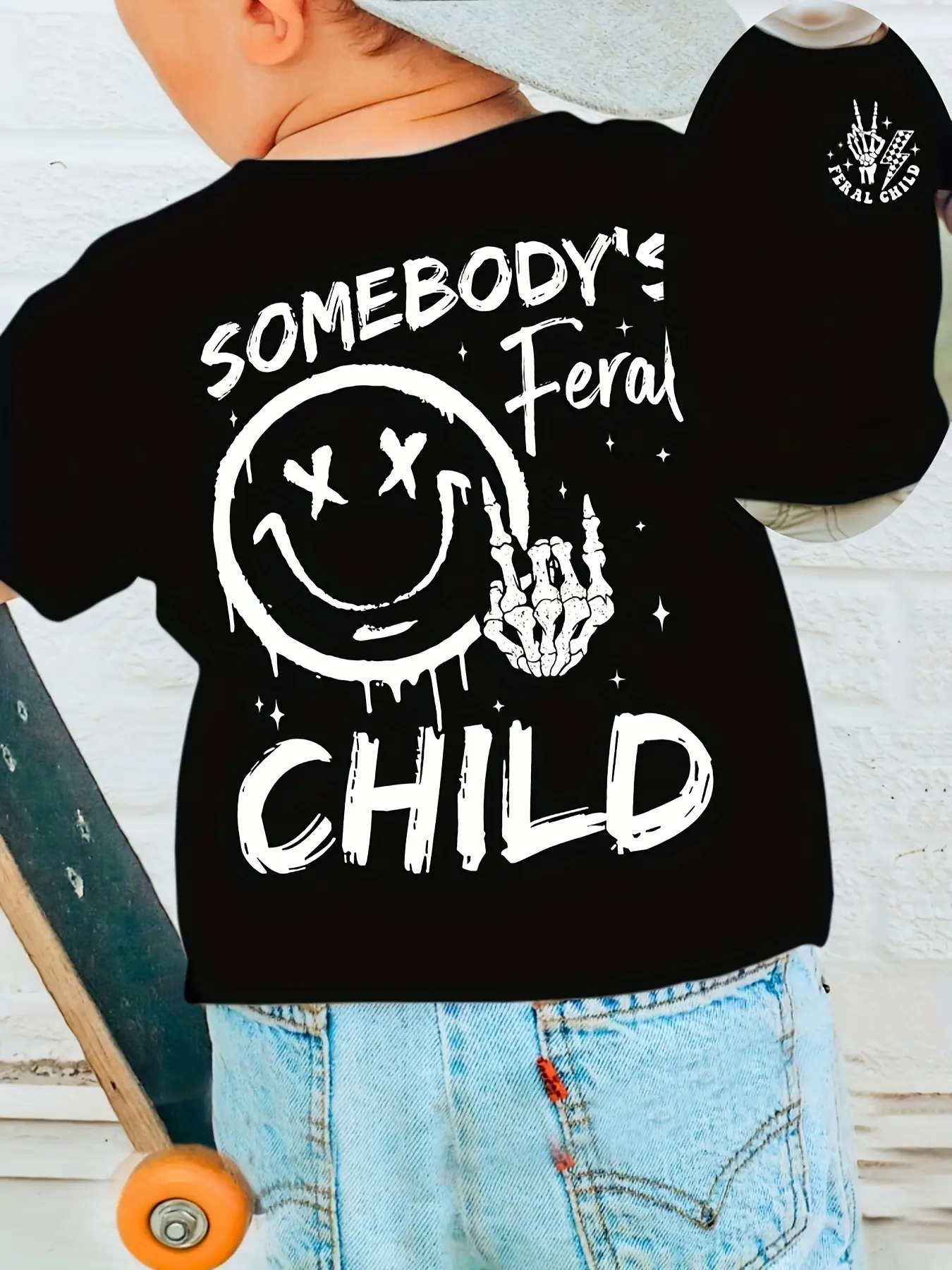 Toddler Boys Somebody's Feral Child Graphic T-Shirt, Retro Skeleton Hand Smiley Face Short Sleeve Cotton Tee for Kids, Casual Streetwear Shirt for Little Boys