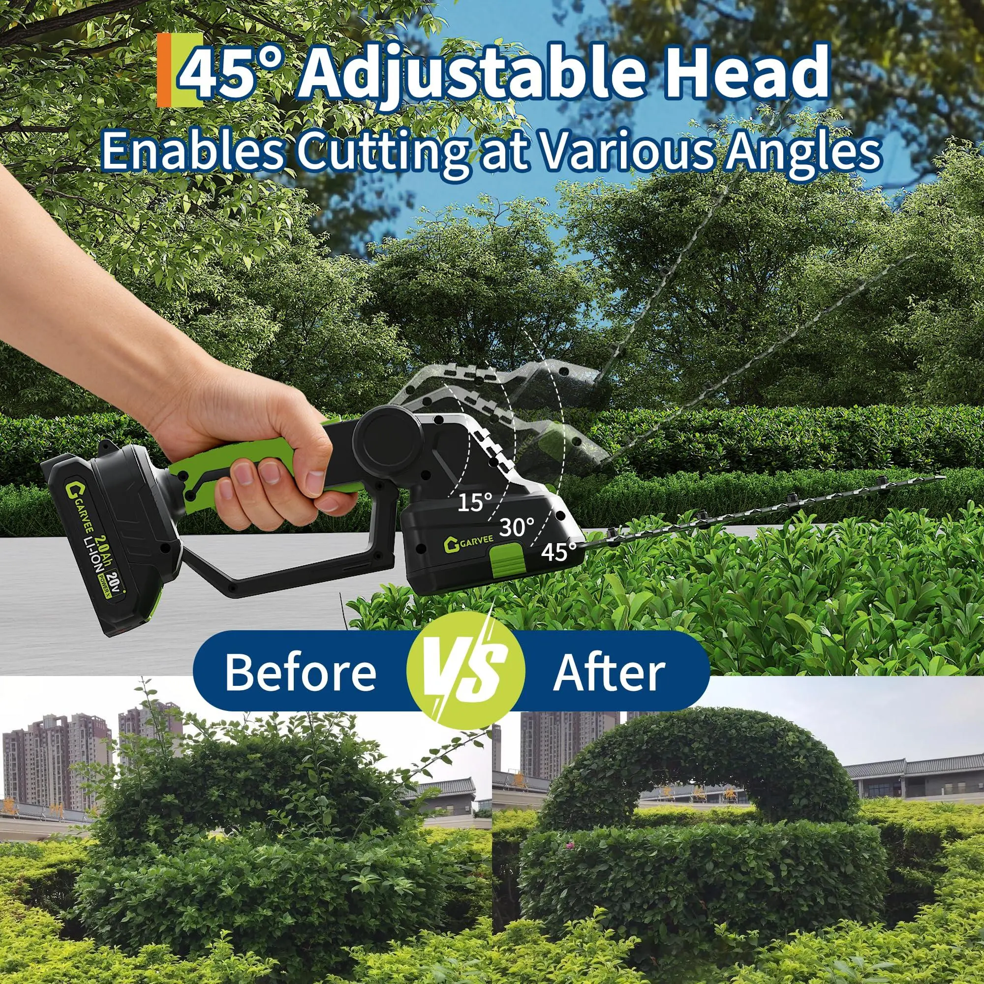 【Adjustable Angle & High-Efficiency Motor】The cordless hedge trimmers with battery feature an adjustable cutting head offering three angle settings: 15°, 30°, and 45°. This enables flexible and comfortable trimming in tight spaces, reducing strain on your back and shoulders. The high-power motor delivers 1200 RPM no-load speed, optimizing cutting performance for easier and more efficient lawn care.
