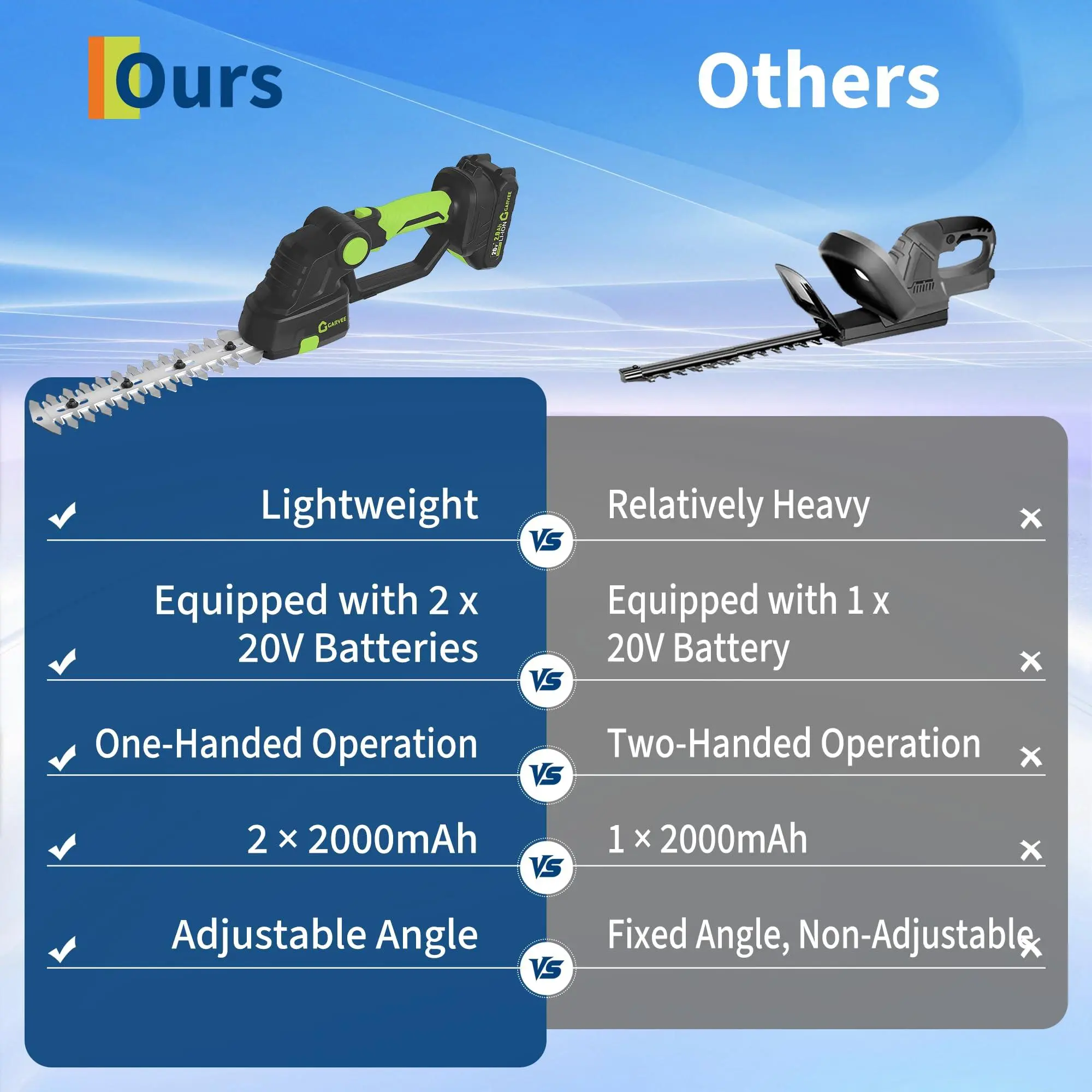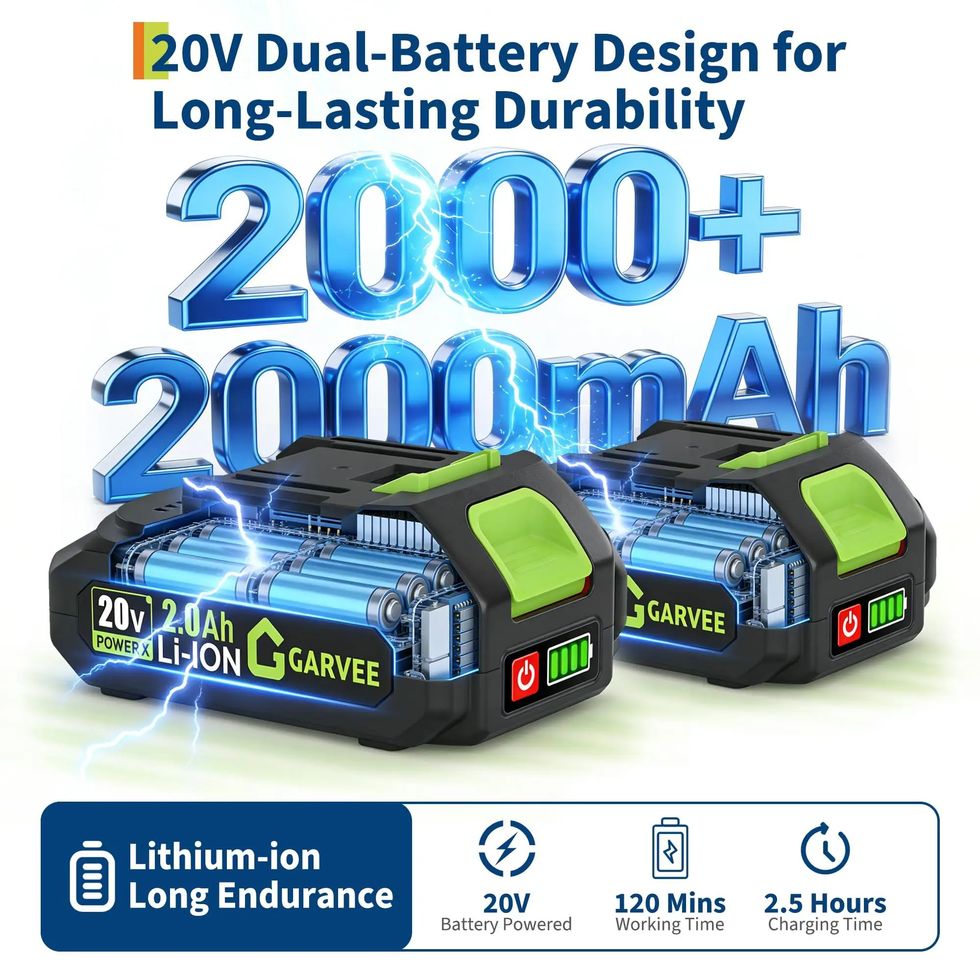 【Rechargeable Battery with Power Indicator】The handheld electric hedge trimmer is powered by a removable 20V 2000mAh lithium-ion battery, charging in just 2.5 hours. Equipped with two batteries, it extends runtime to approximately 120 minutes. The power indicator helps monitor battery levels, ensuring uninterrupted power for trimming tasks.