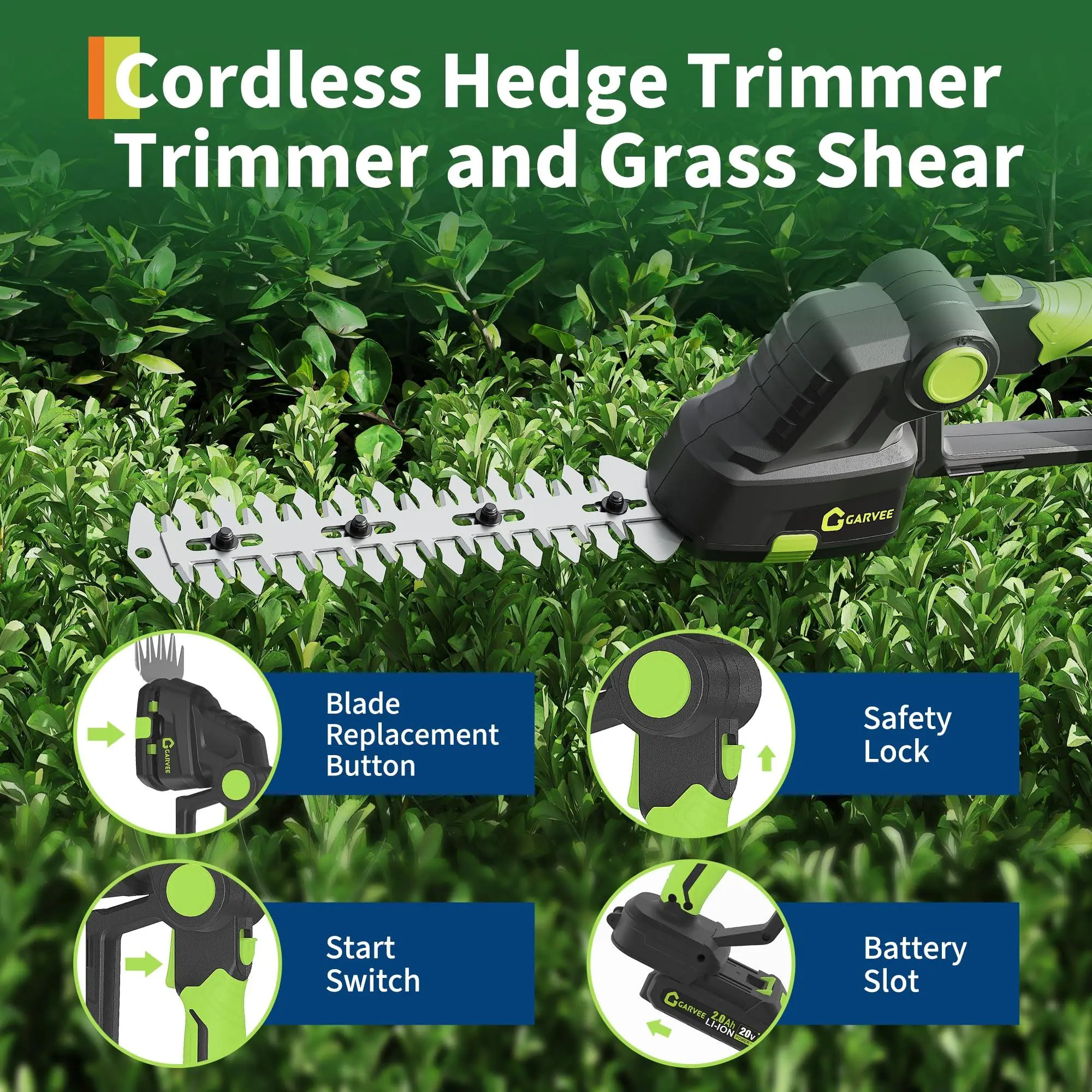 【Professional 2-in-1 Trimming Tool】This electric hedge trimmer features a blade release button for quick and easy switching between grass trimmer and hedge trimmer modes. The short blades are designed for trimming lawns and small grassy areas, while the long blades deliver precise trimming for hedges, shrubs, trees, and ornamental plants' fine branches.