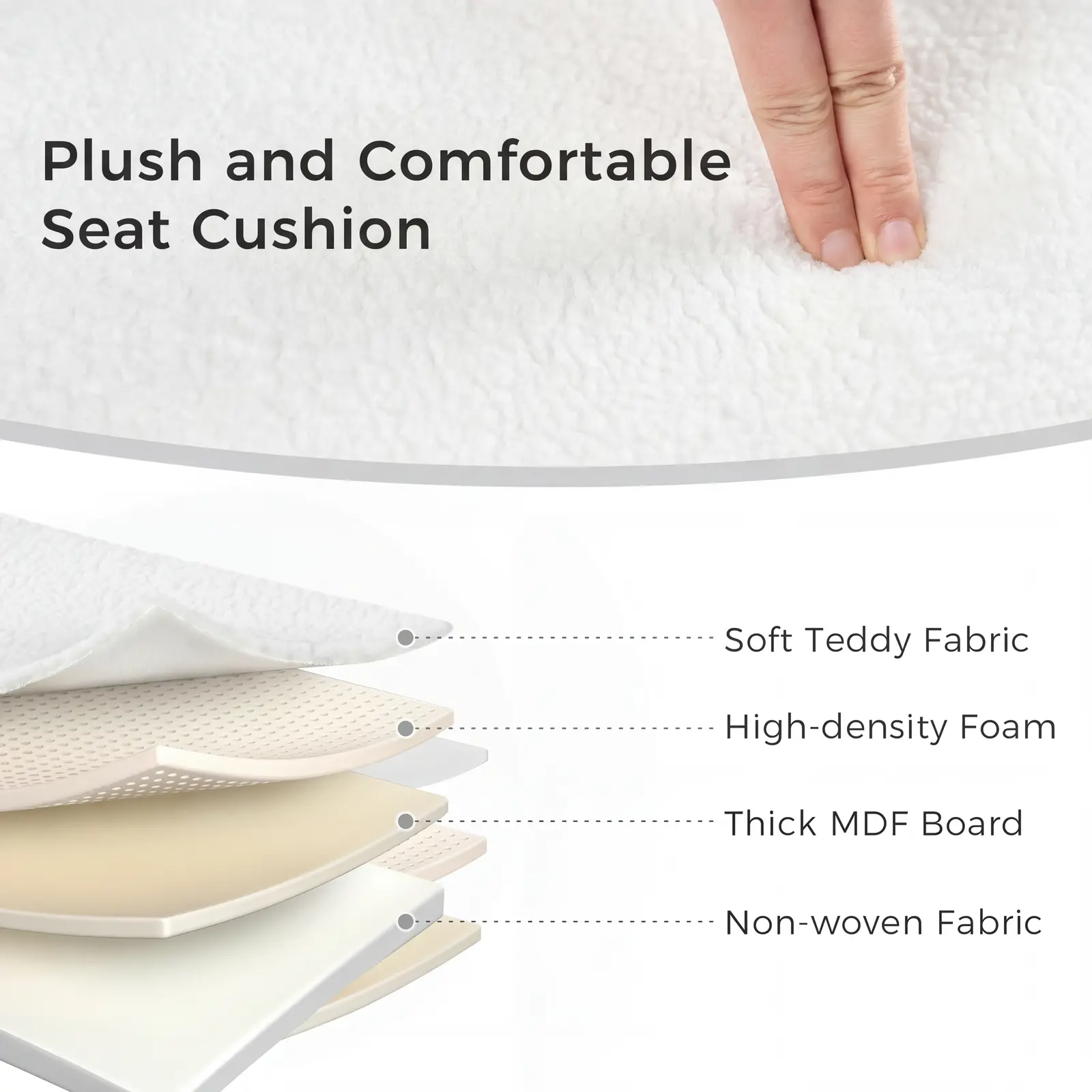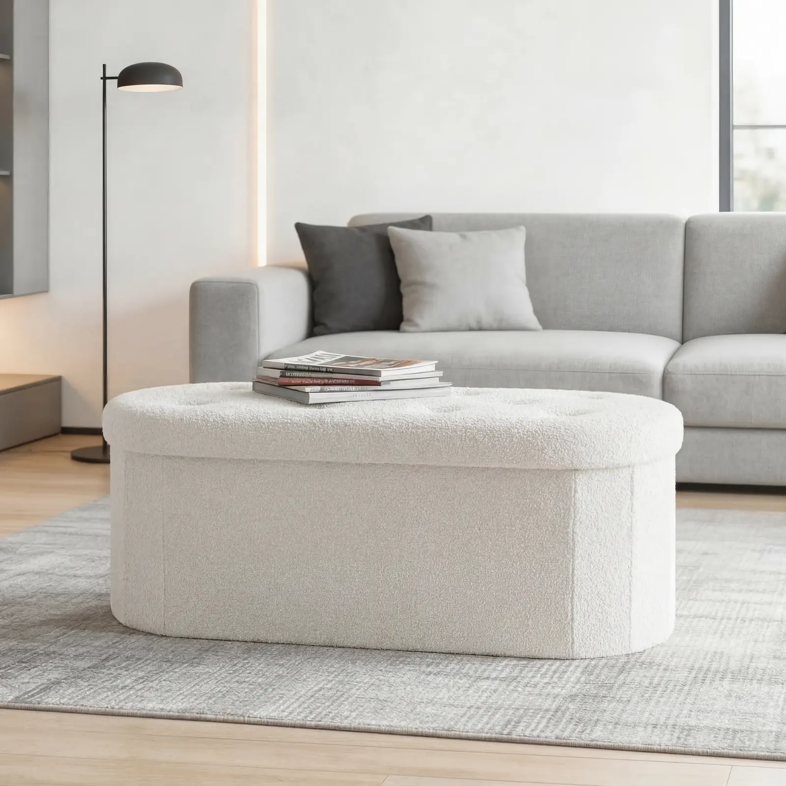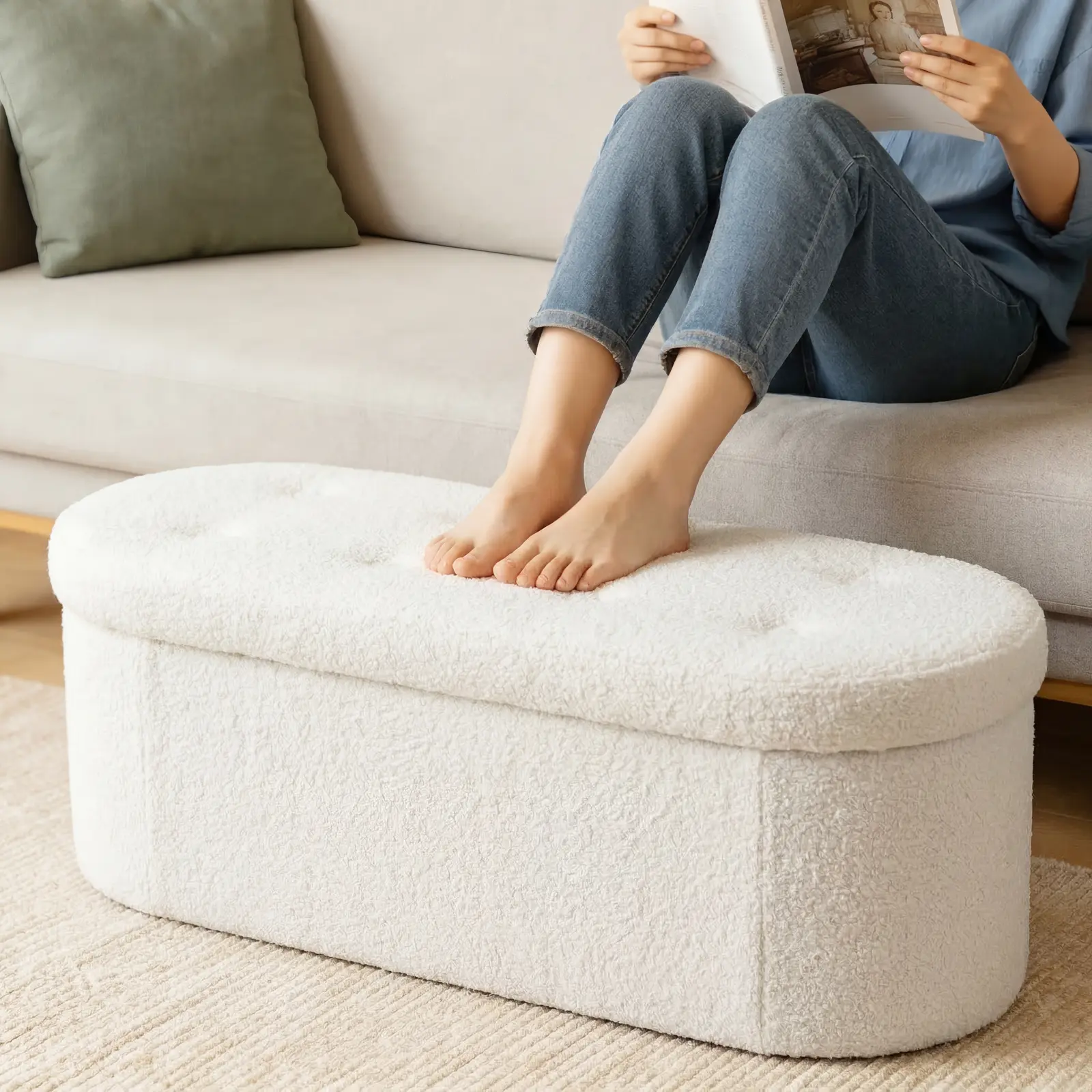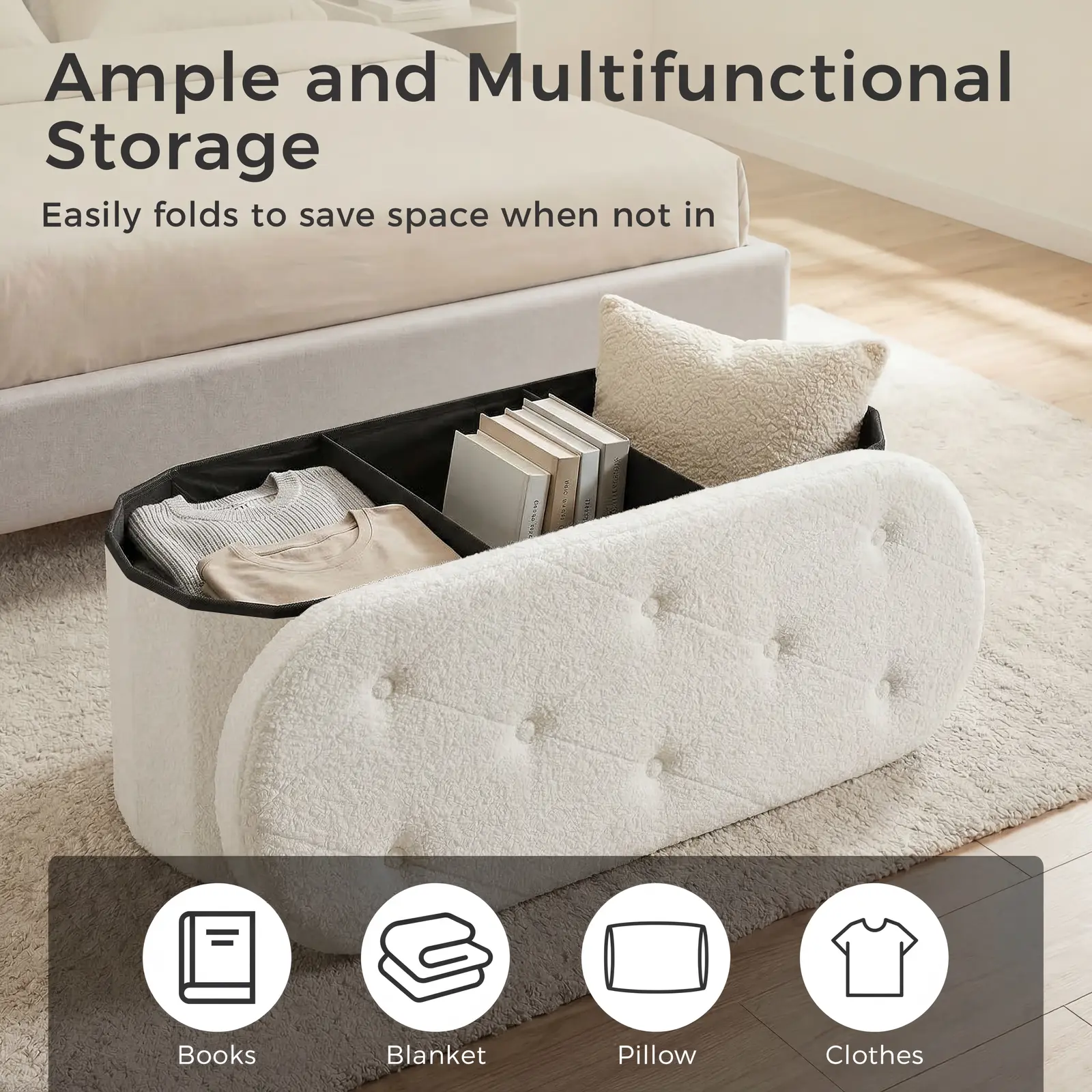 ·【STYLISH & VERSATILE】More than just a storage piece, its soft teddy fabric delivers a cozy touch, while clean oval lines bring understated modern charm. Versatile for entryway shoe bench, bedroom bed-end stool, or living room footrest, blending beauty and function seamlessly.
