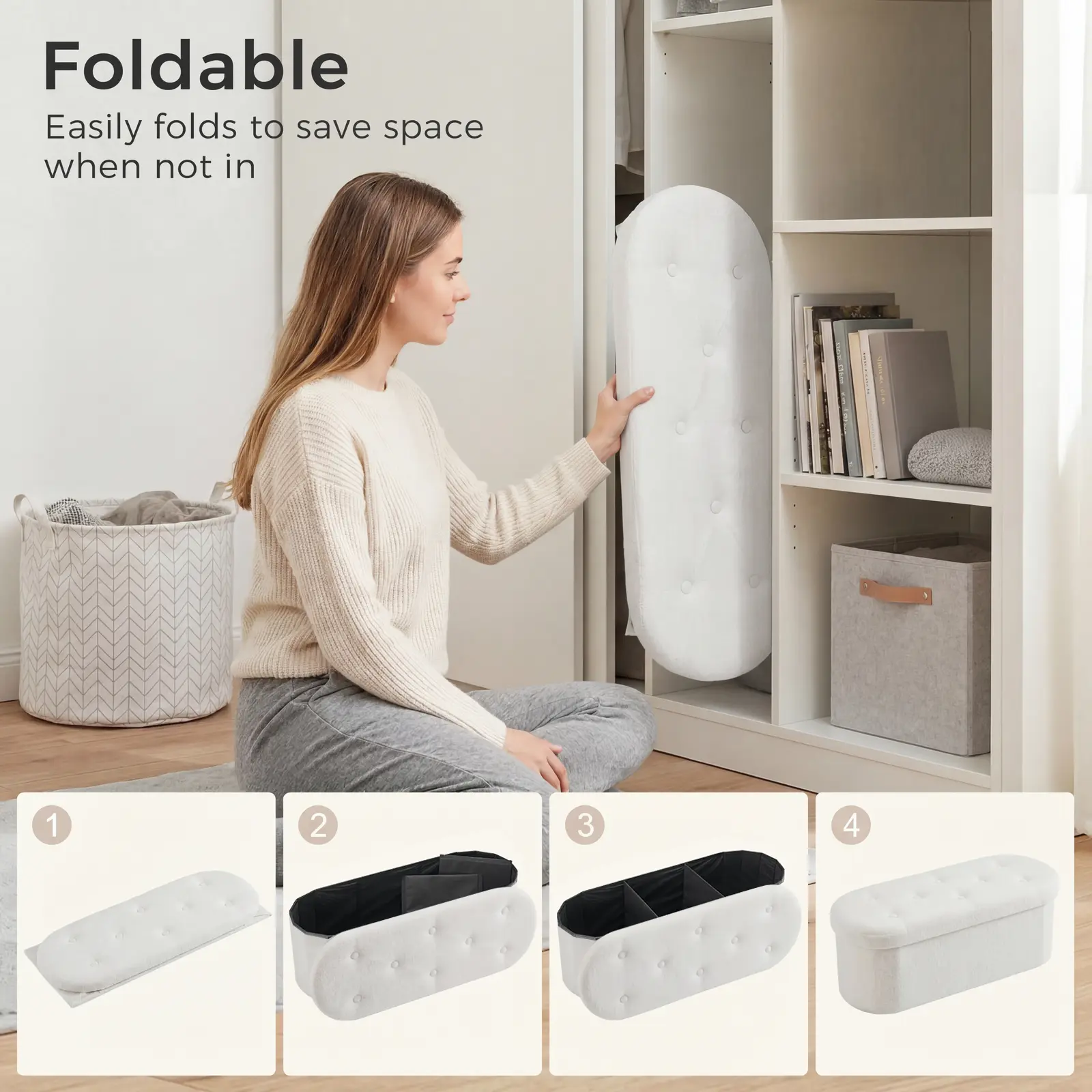 ·【EASY ASSEMBLY & FOLDABLE】Setting up this ottoman takes just seconds—simply unfold, position the base, and place the lid.Its lightweight folding design allows for easy storage under the bed, in a closet, or in any tight space when not in use.A convenient and space-saving addition to any home.
