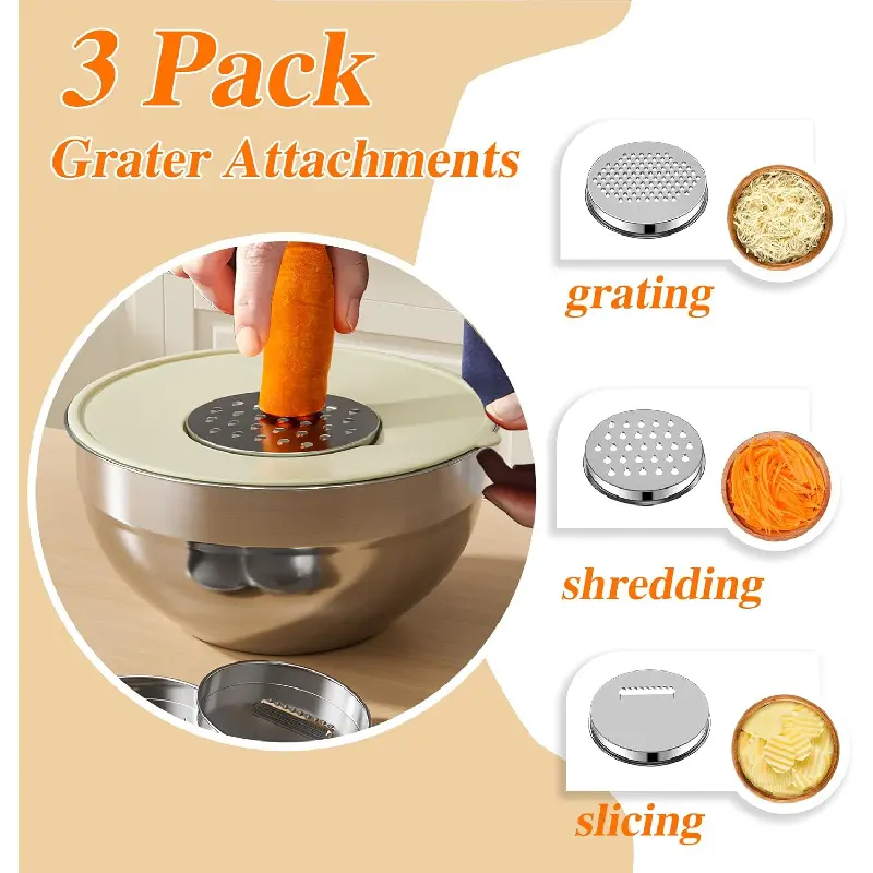[Airtight Lids & 3 Grater Attachments]Flexible plastic lids closely fit the bowls, keep your food fresh, 4.5qt had a removable lid inside the main lid, for adding contents or pairing it with your blender without removing the entire lid to prevent splatters or spills.This serving bowls set comes with 3 different grater attachments (slicing/grating/shredding) just shred or slice right into the bowl!