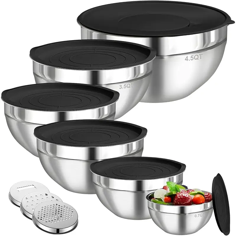 [Various Size & Large Capacity] You will get 6 piece mixing bowls stainless steel (4.5, 3.5, 2.1, 1.5, 1.1, 0.7QT) and 6 airtight lids.Another 3 grater attachments can help you shredding, slicing and grating food.These mixing bowls set can satisfy your demands for dressing salads, mixing eggs, making dough, washing vegetables and storing, etc.