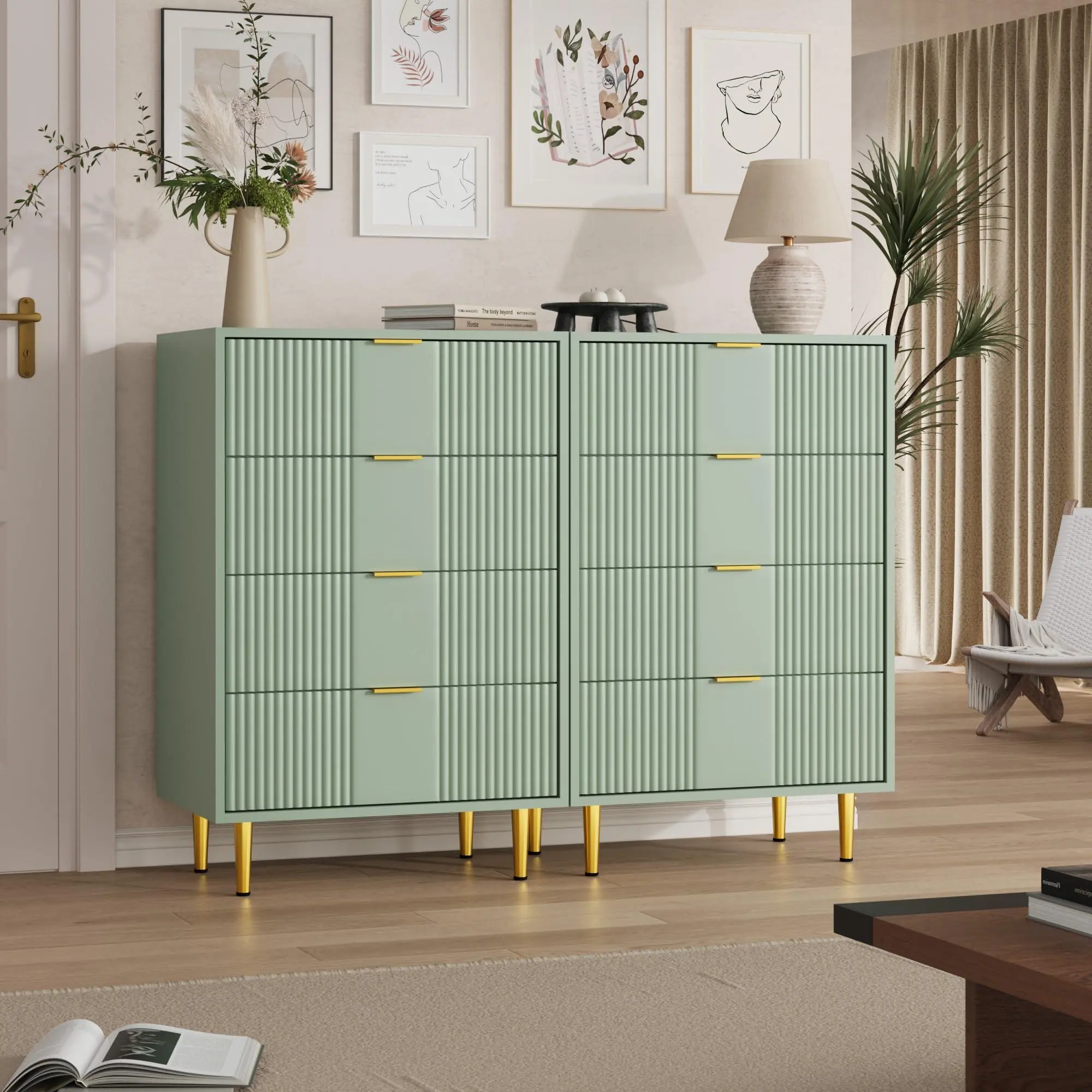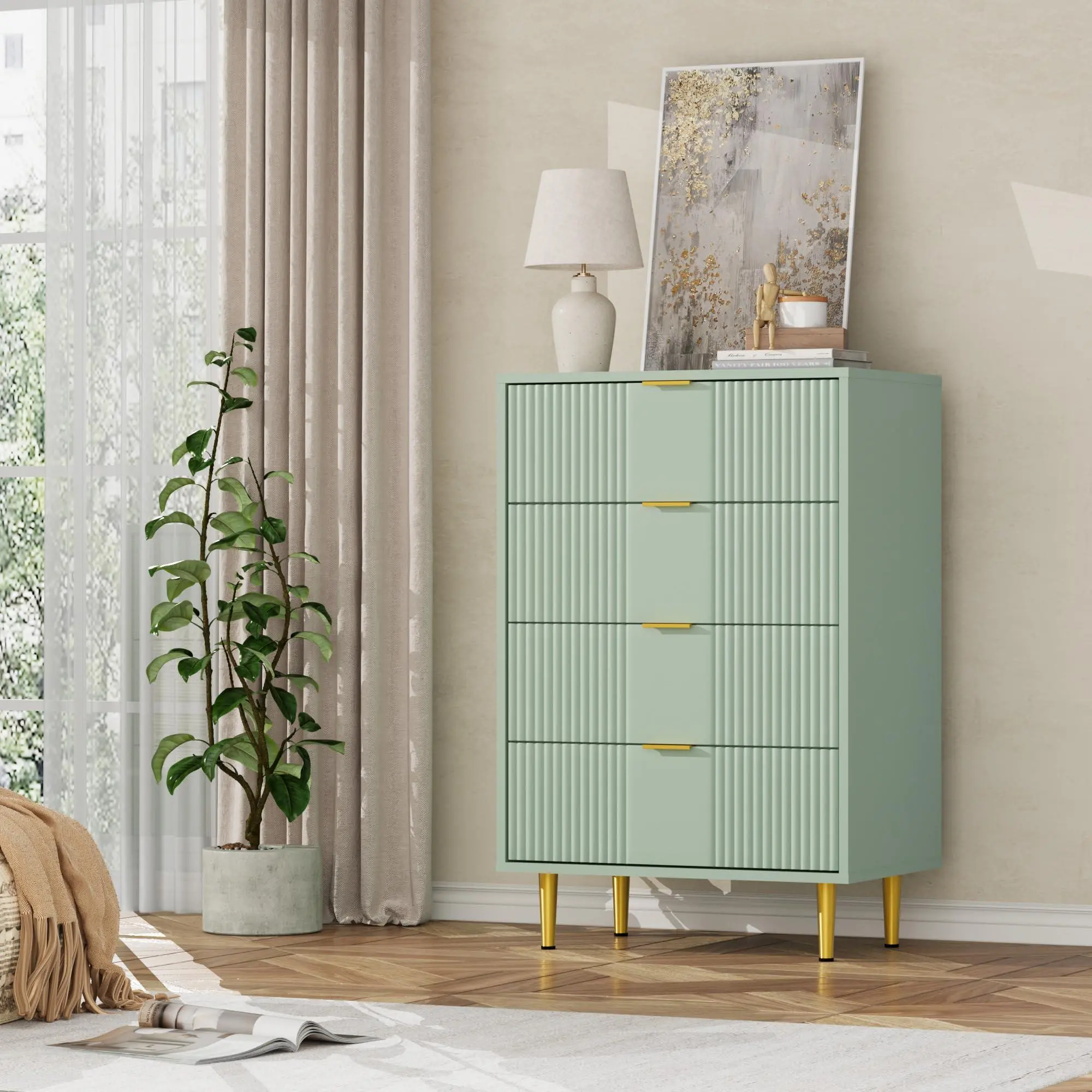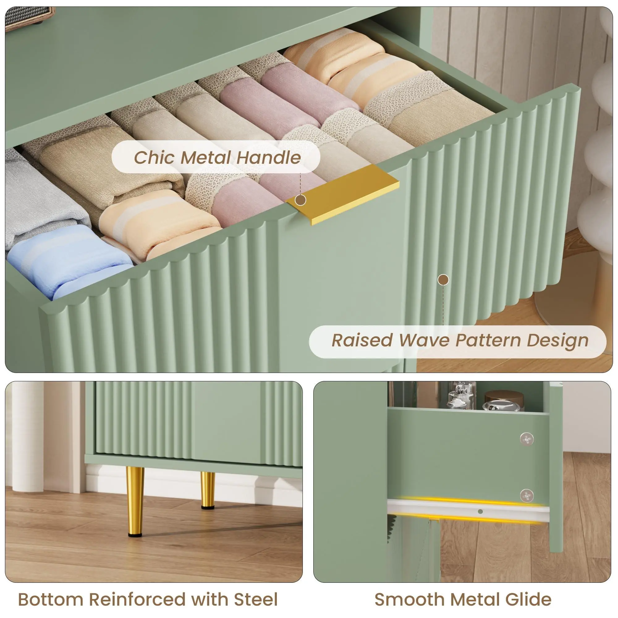 【Modern Chic Appearance】The unique wave-like fluted panel enhances the texture and elegance of this bedroom dresser. The thick table top features natural grain that complements the natural finish. The wide metal handle and splayed base legs add a modern touch, creating a personalized and distinctive appearance