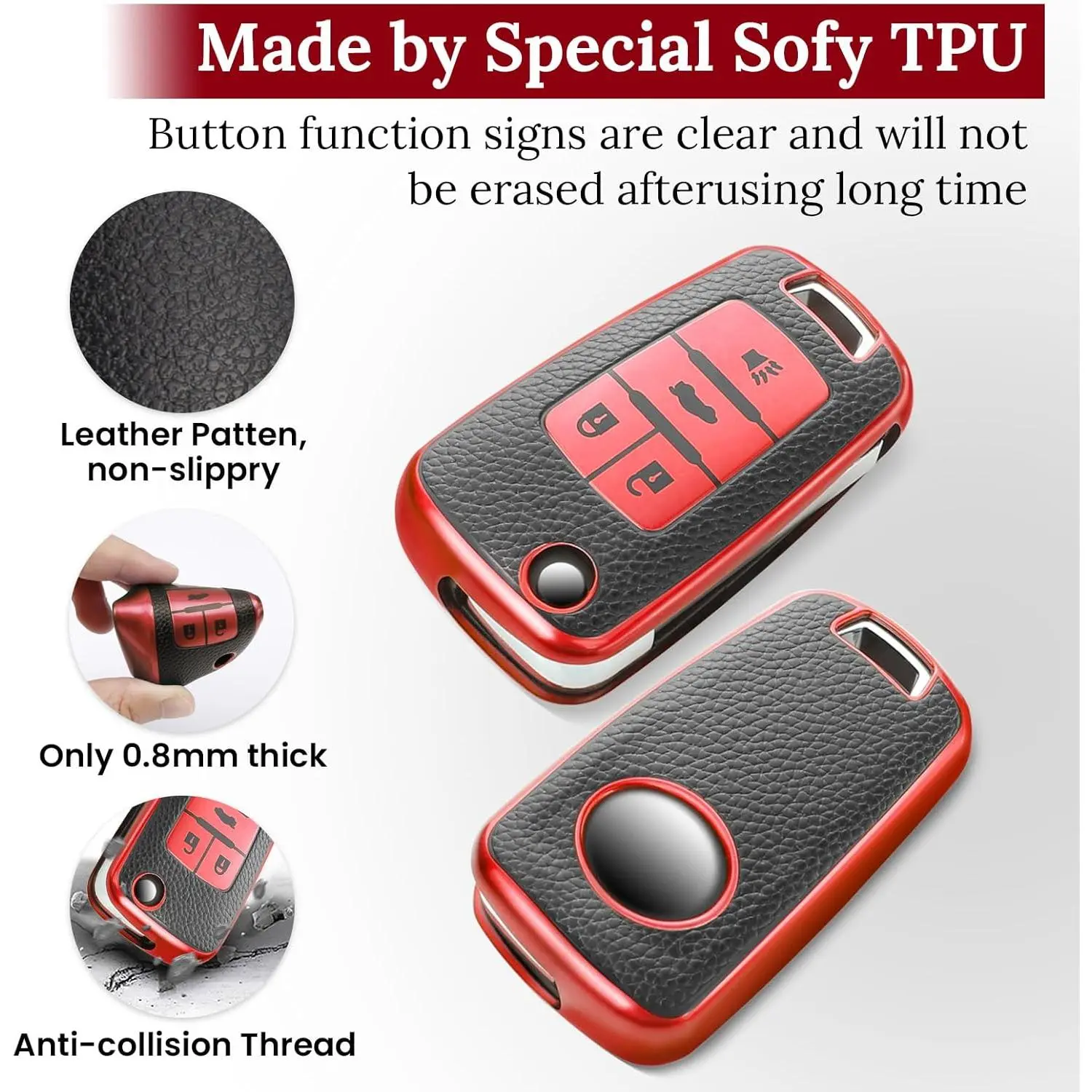 This key fob cover is designed for Chevy models like Cruze, Equinox, Malibu, Sonic, Trax, and Impala. It features a TPU surface with a grain texture, offering a sleek look. The cover includes a carbon fiber style belt keychain, enhancing both style and functionality. Perfect for 4-button key fobs, it comes in a striking red color (A2).