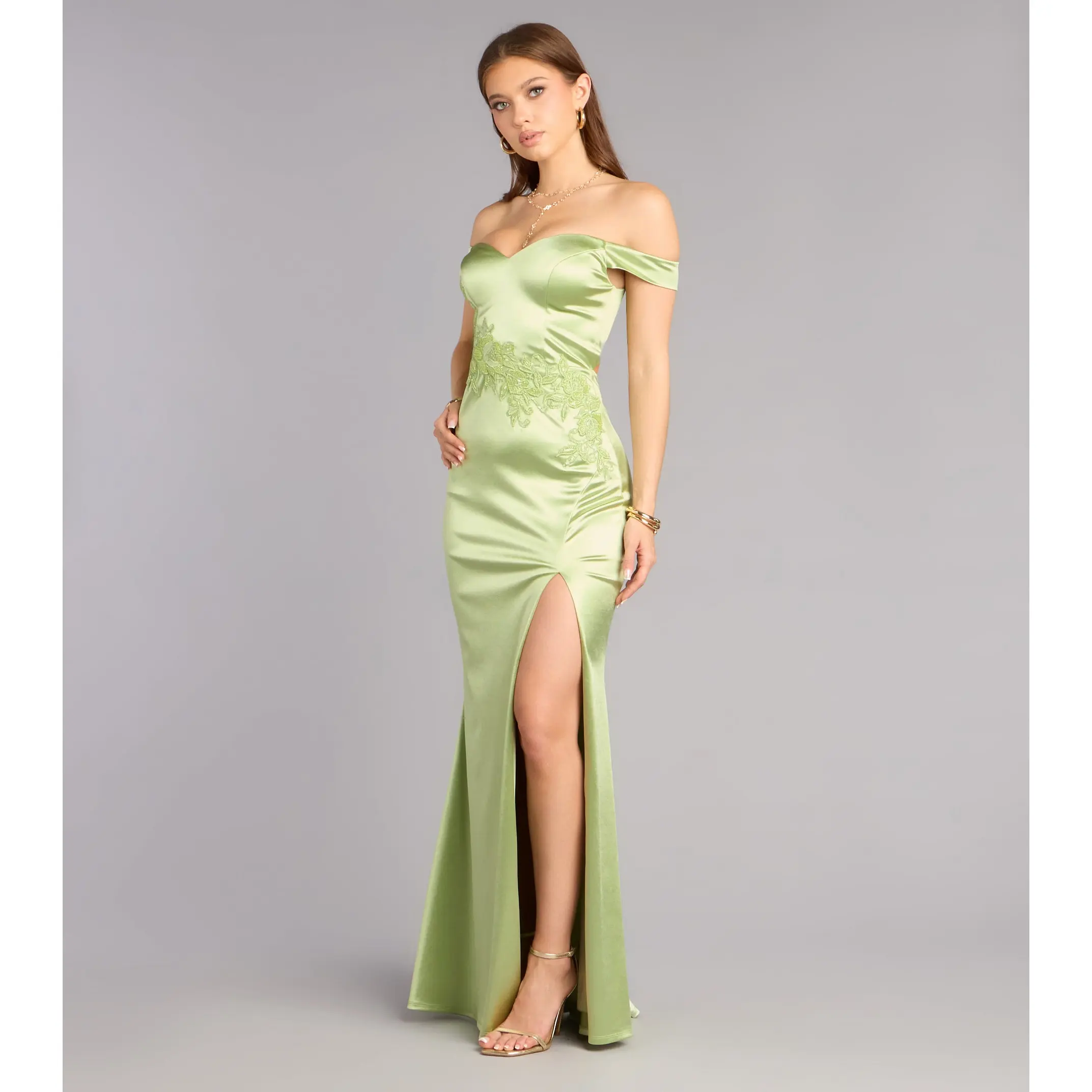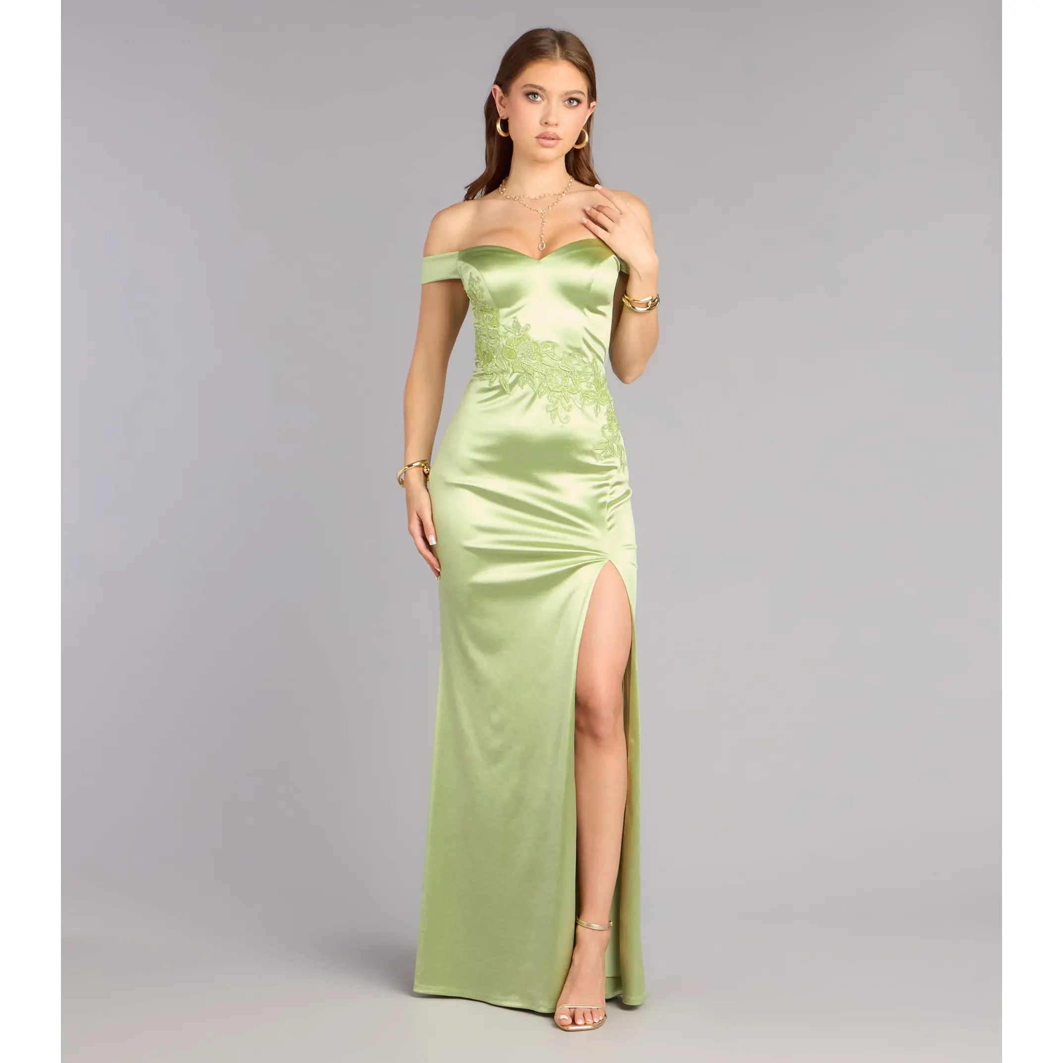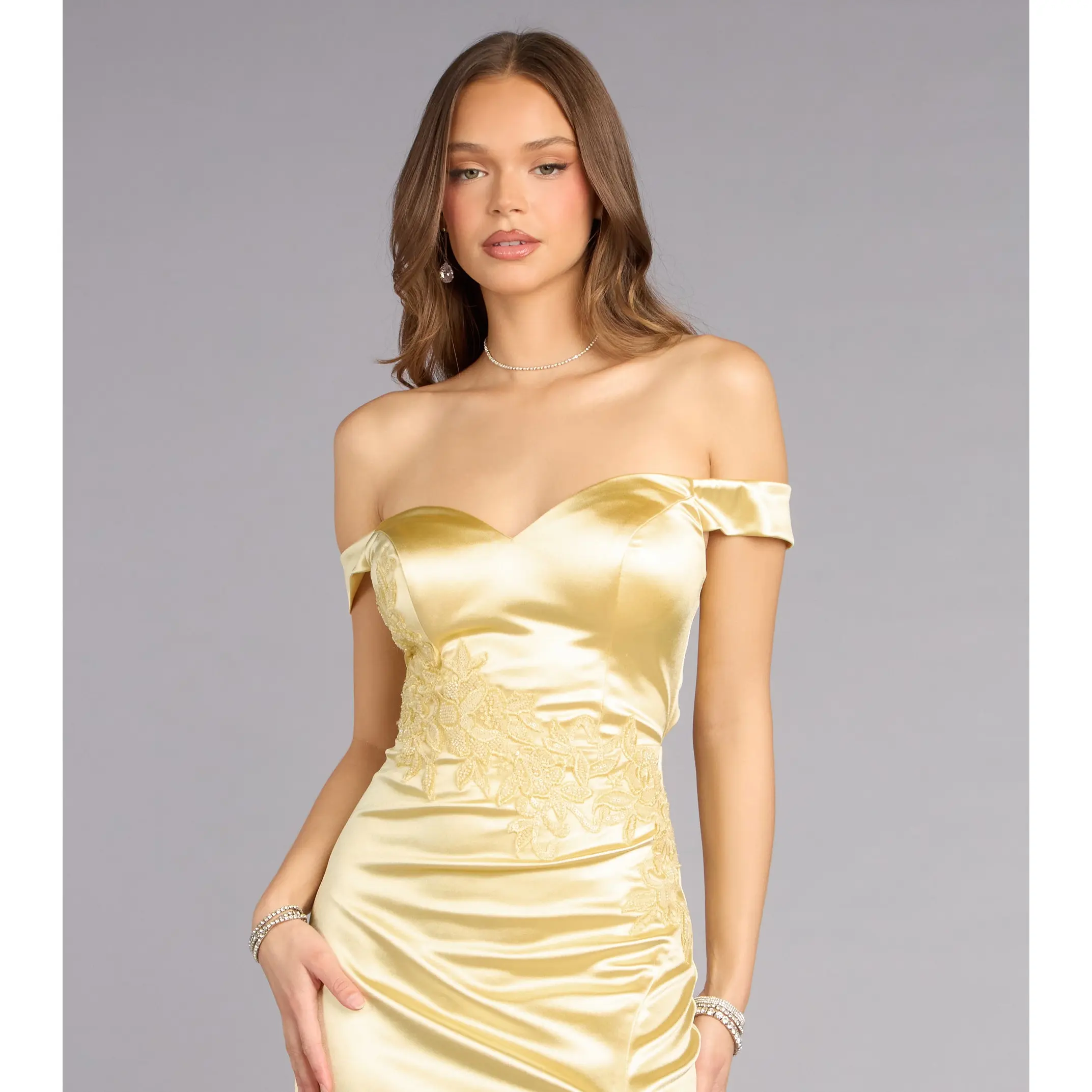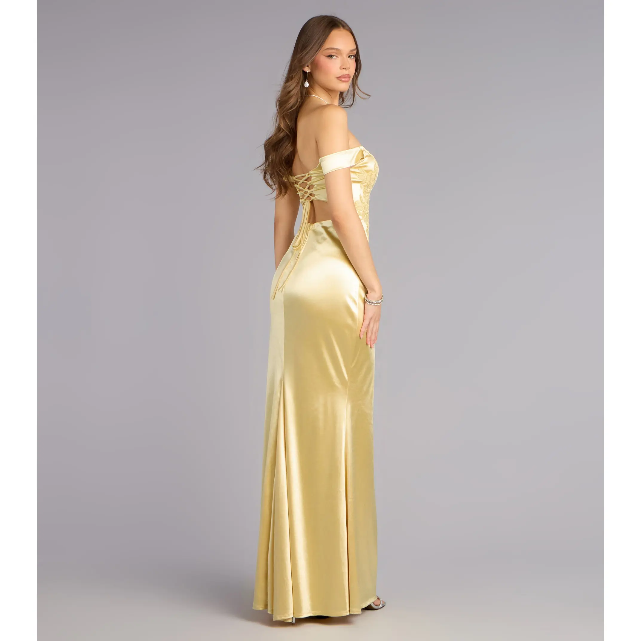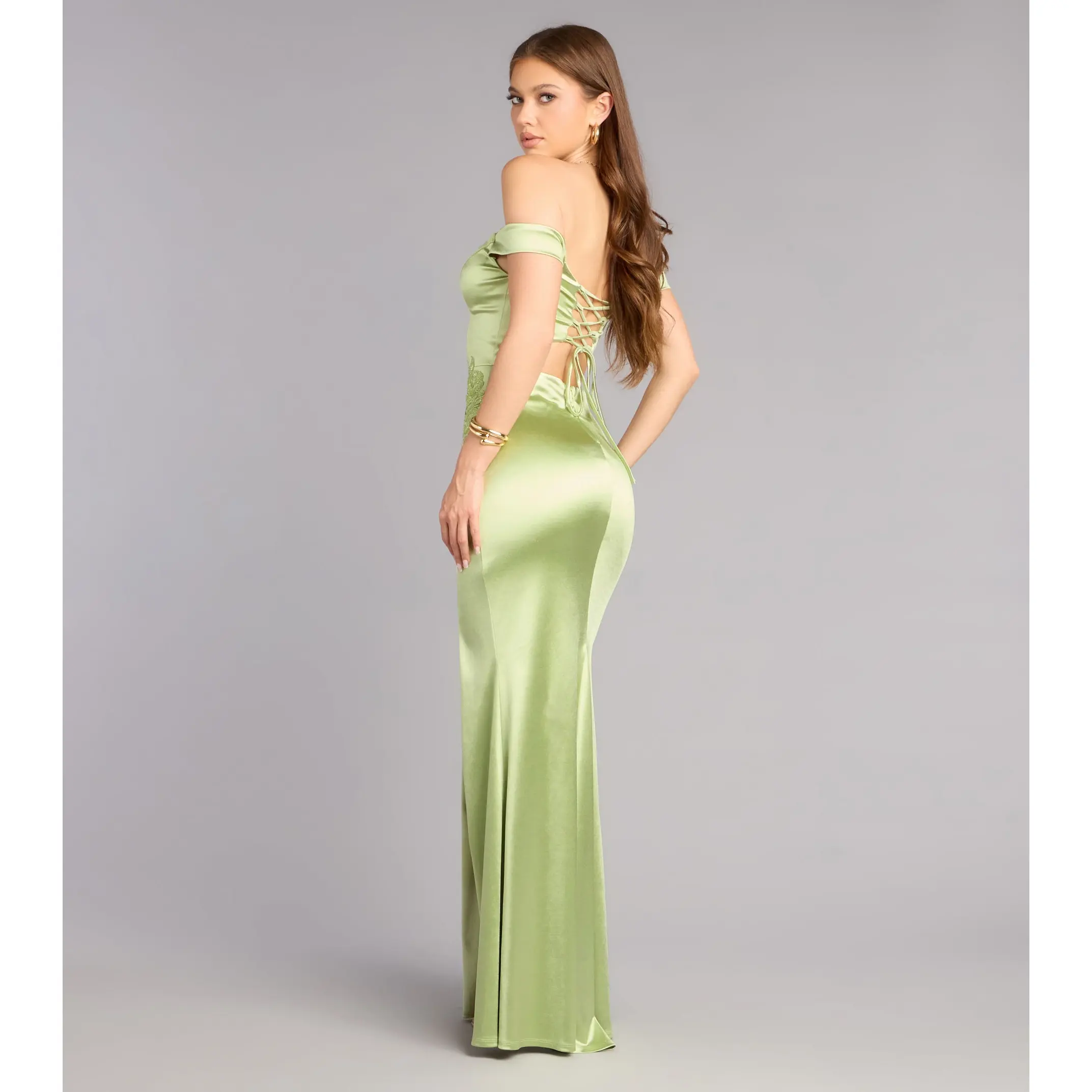 The Stevie gown pairs luminous satin with a sculpted mermaid silhouette that flatters from every angle. The beaded applique adds soft dimension, while the lace-up back brings a touch of drama that feels equal parts refined and unforgettable.