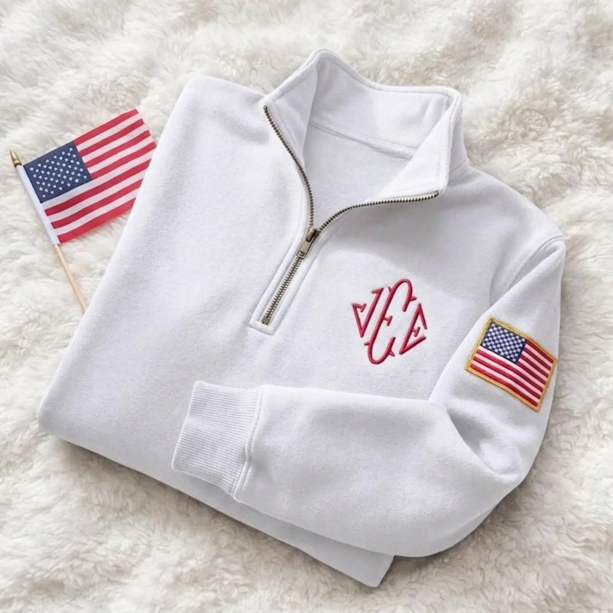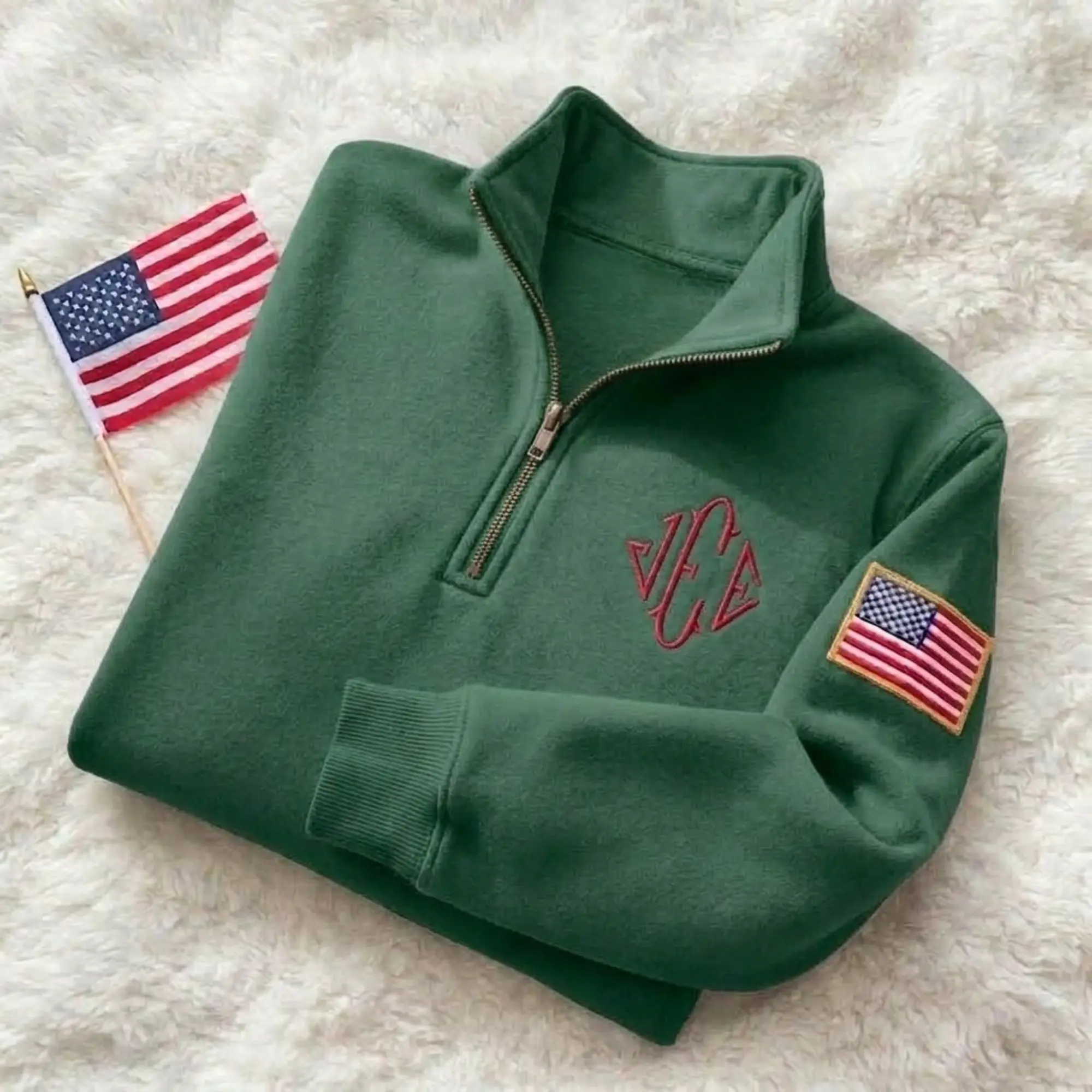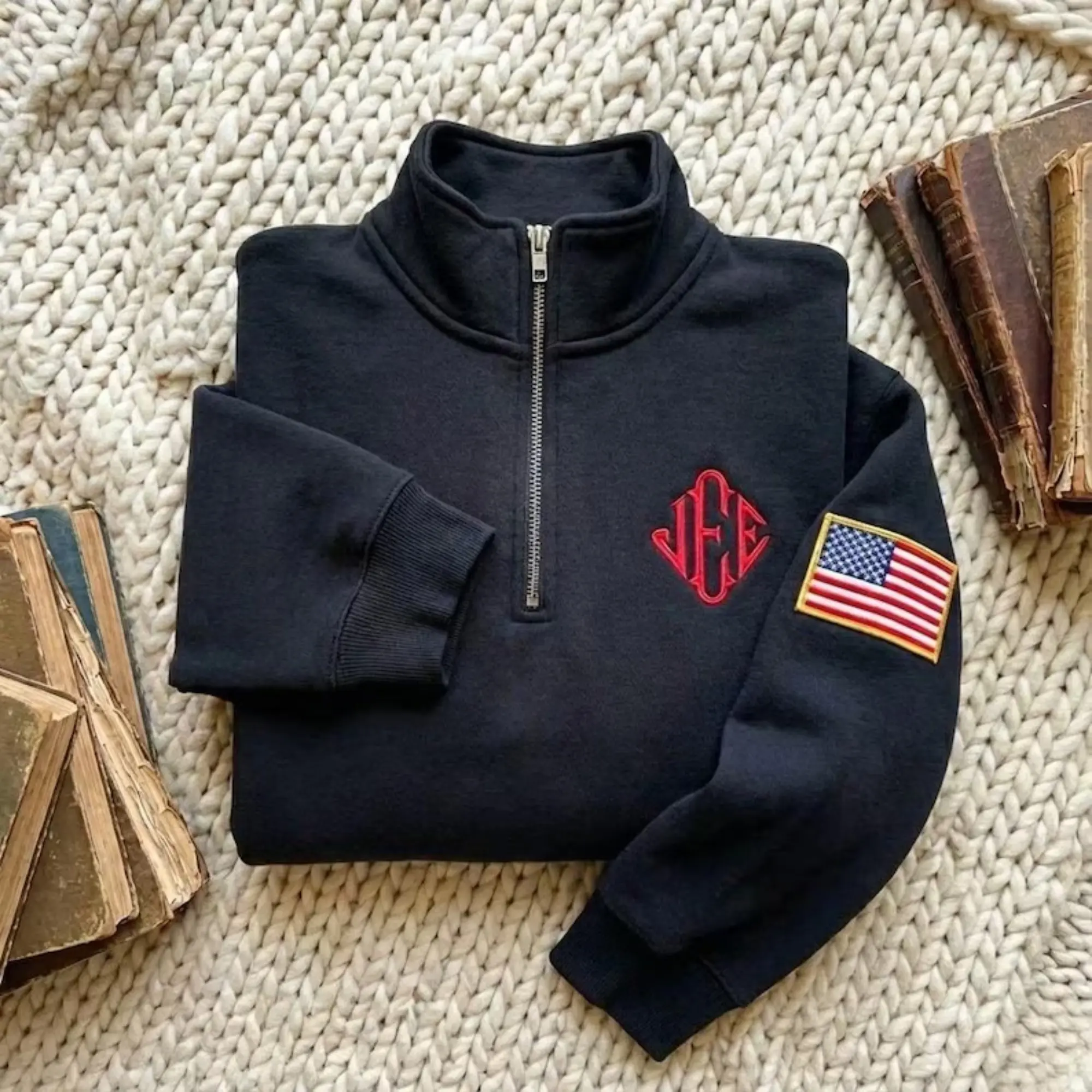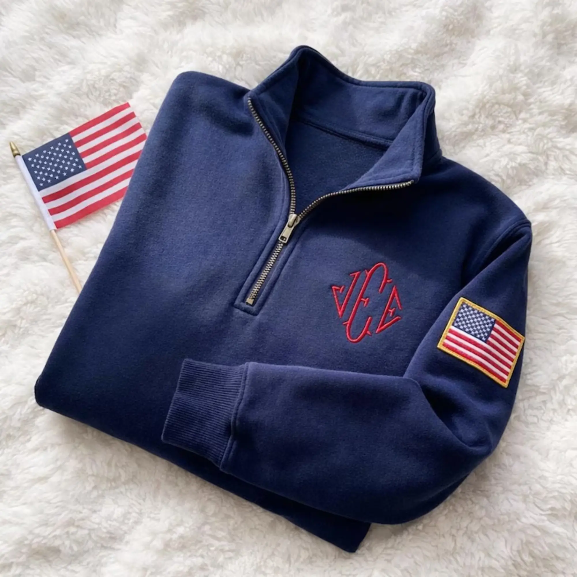 Stay warm in style with this custom embroidered quarter zip sweatshirt, designed with a clean, modern look and a touch of American spirit. This navy pullover features a personalized monogram embroidery on the chest and a detailed USA flag patch on the sleeve, making it both stylish and meaningful.