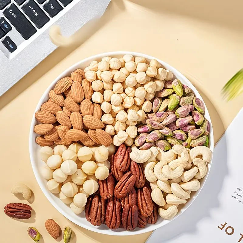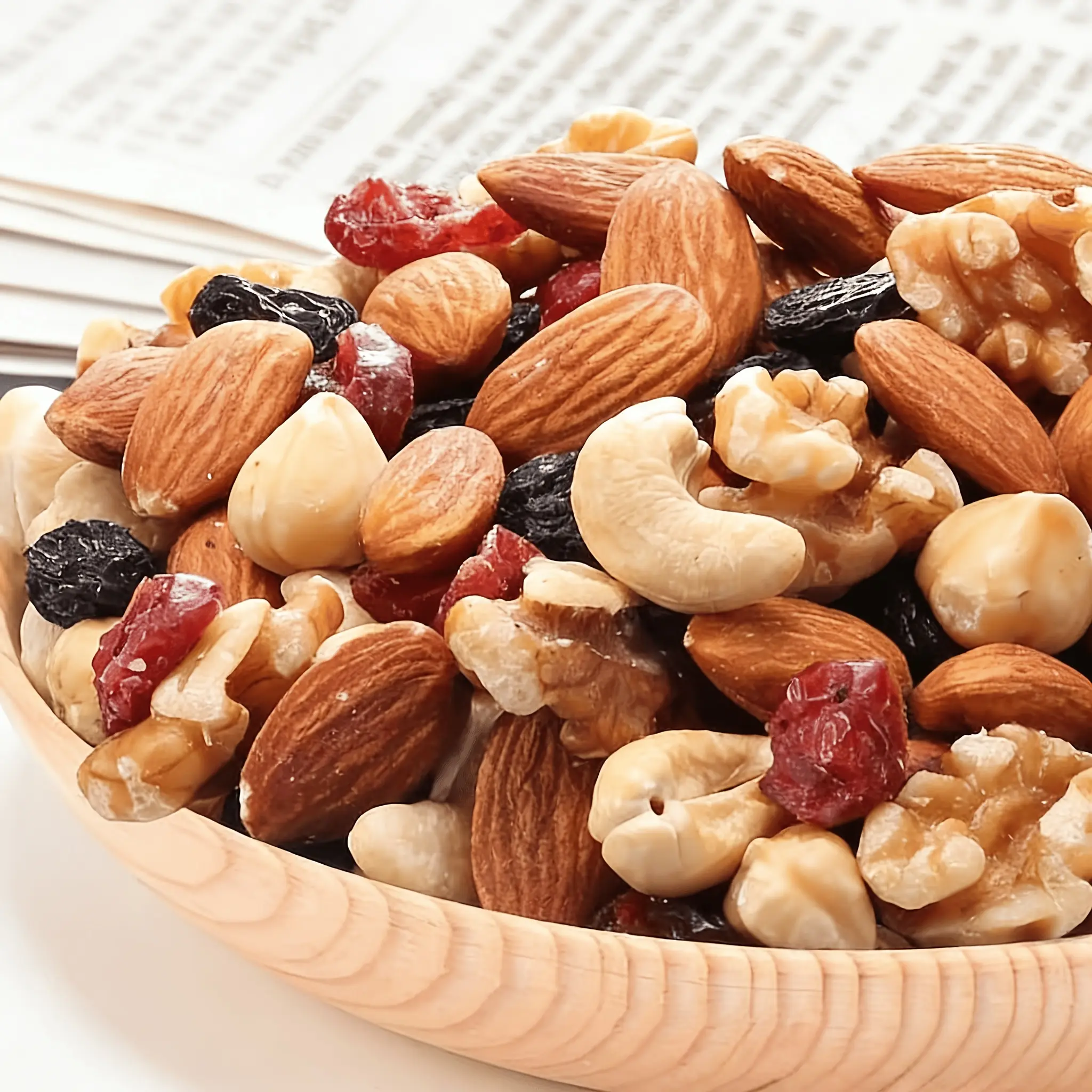 Mixed nut pieces (hazelnut, almond, cashews, walnut, dried grapes, dried cranberries); gluten-free snack; energy boost before and after workouts; low sugar, high protein; crunchy and tasty; individual small packaging for office snacks.