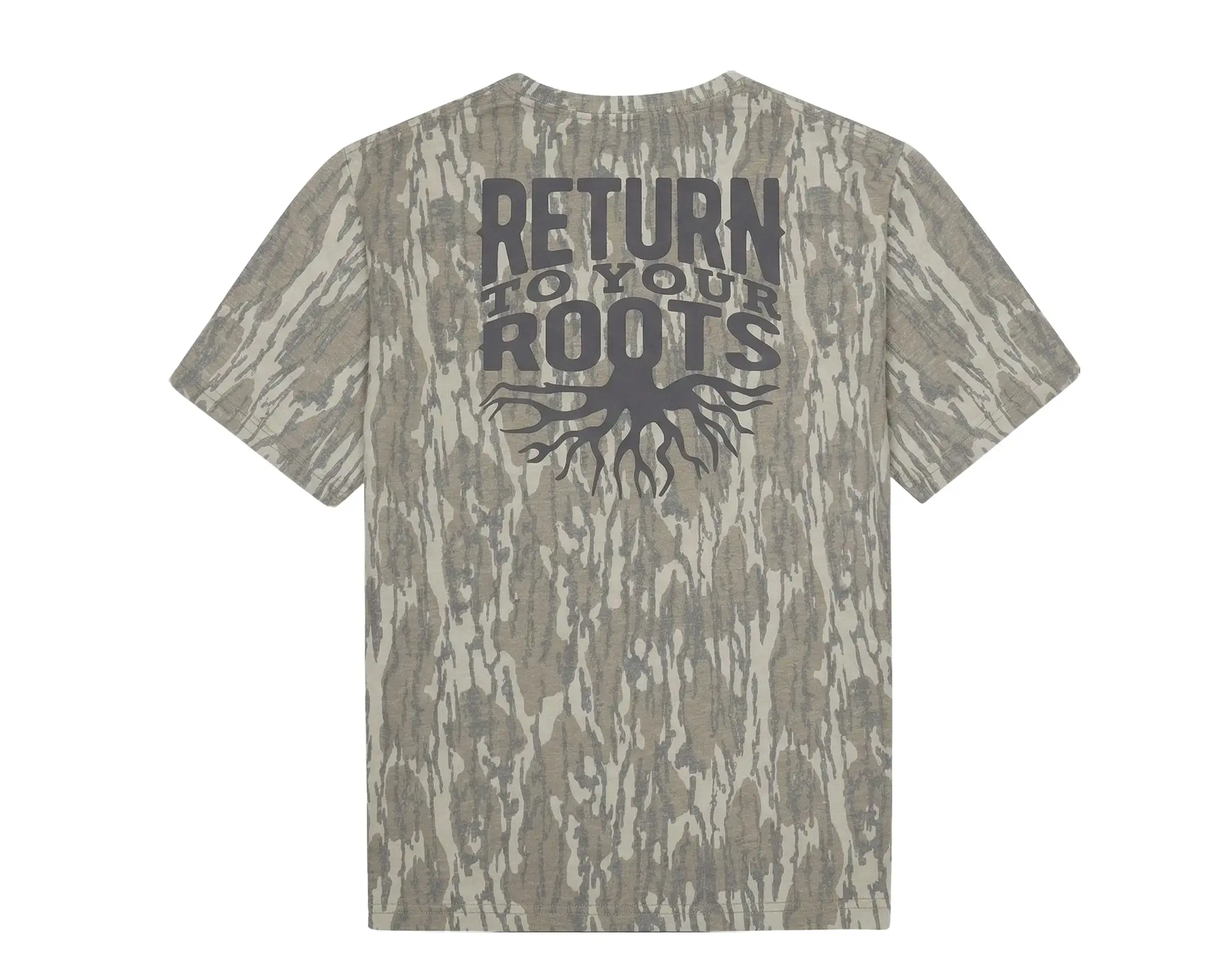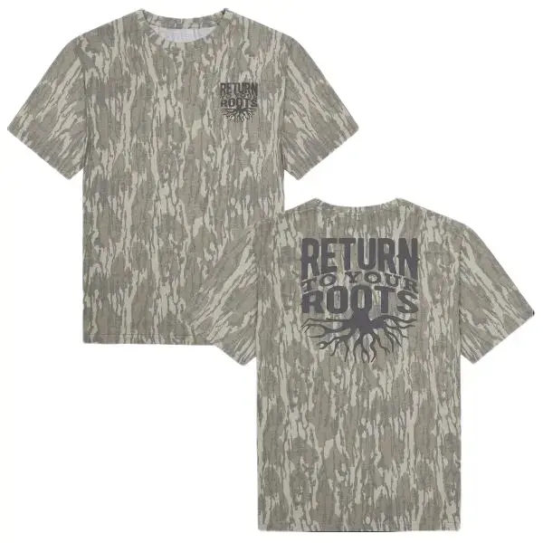 Return To Your Roots Camo T-Shirt, Vintage Bottomland Camo Graphic Tee, Roots Hunting Heritage Shirt, Meaningful Outdoor Lifestyle Tee, Retro Wood Camo Roots Top