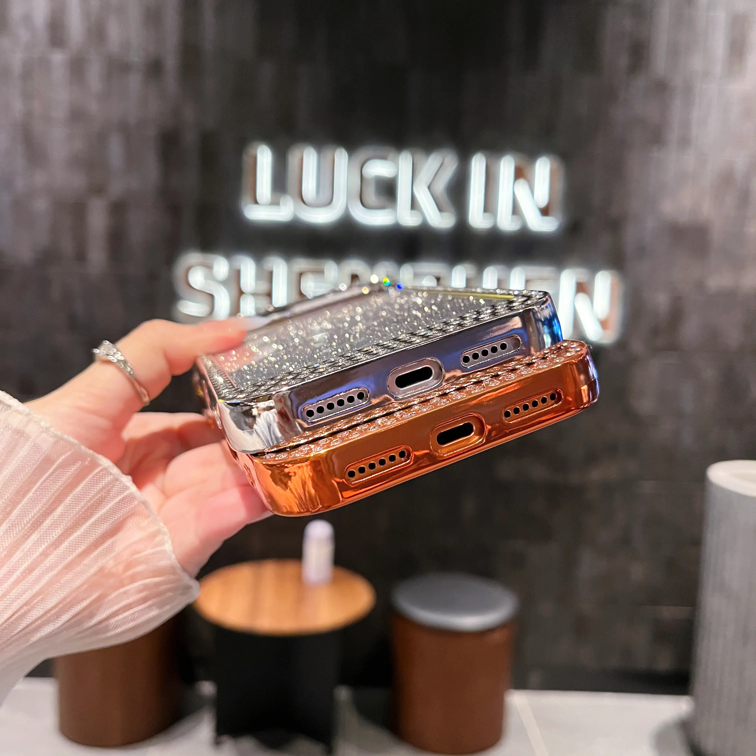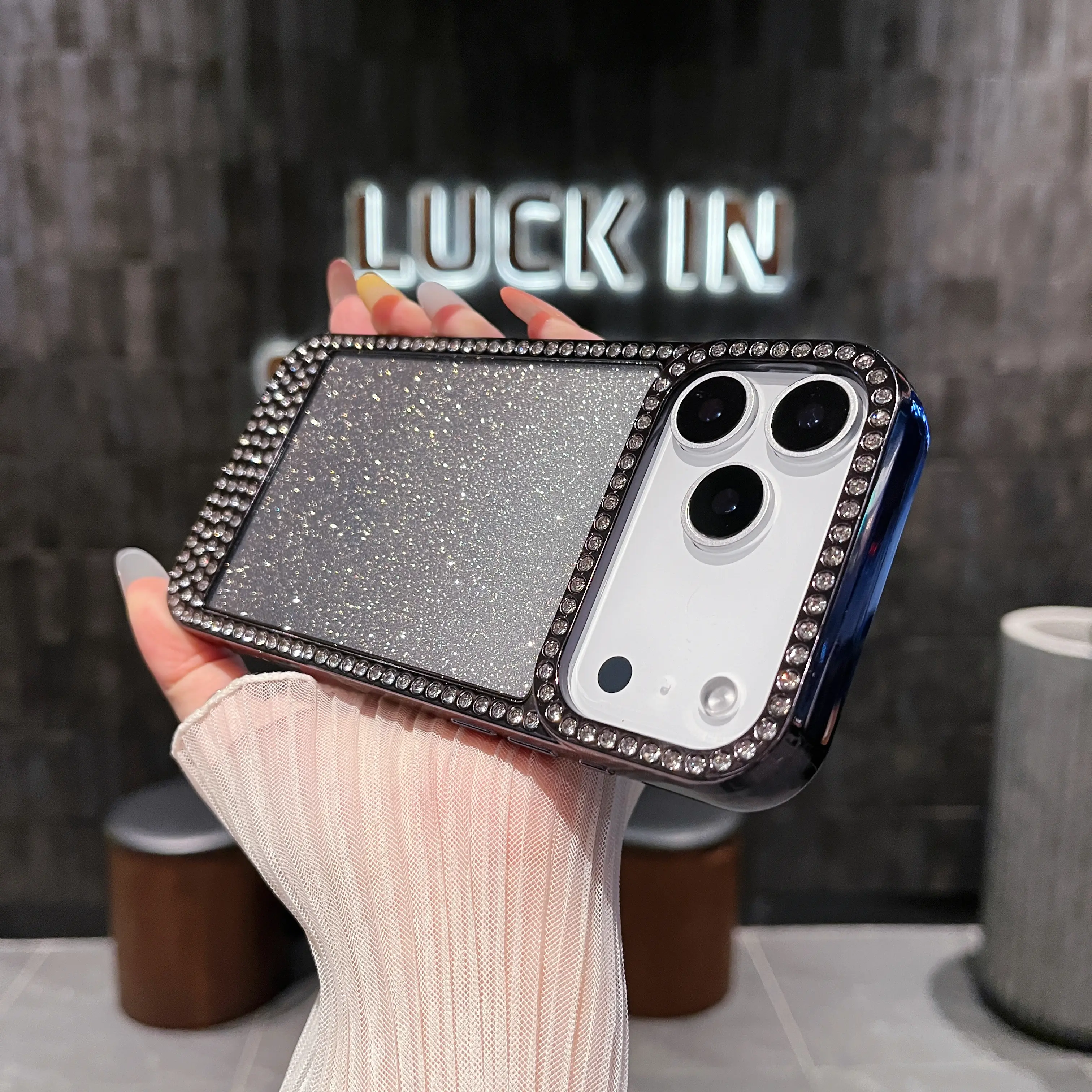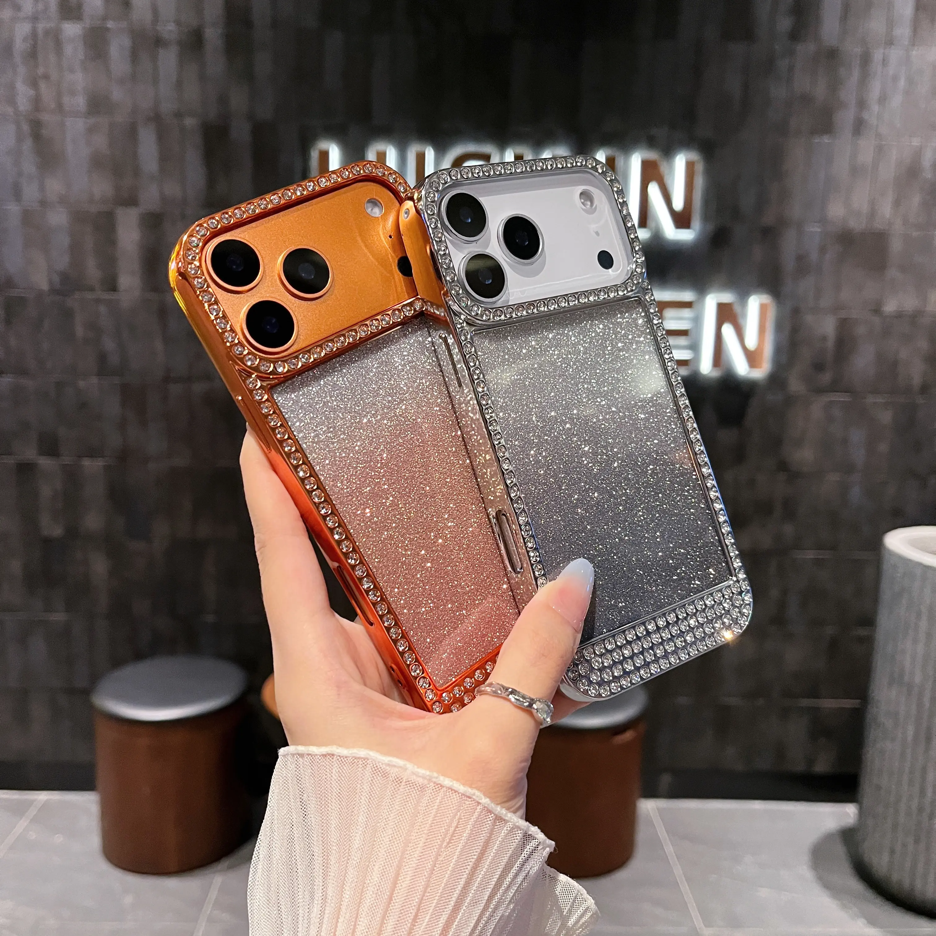Full rhinestone encrusted frame + camera bezel + gradient glitter back panel, finished with premium gold electroplating