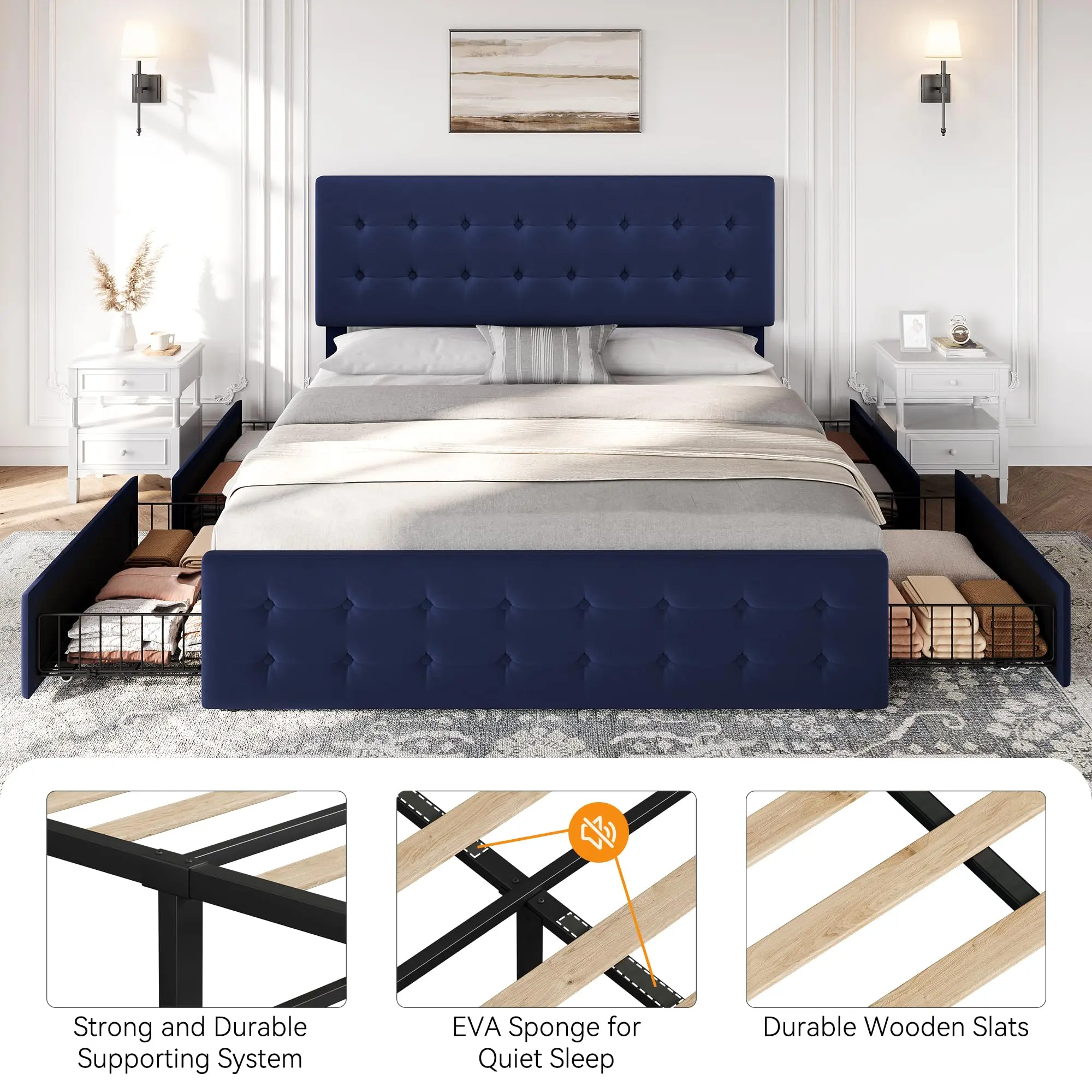 ·【Sturdy and Quiet】The king size bed frame with drawers features 12 durable wooden slats for added stability and a weight capacity of up to 1000 pounds, making it safe for kids to play on. We've also included EVA sponge strips to reduce noise and ensure a peaceful sleeping experience.