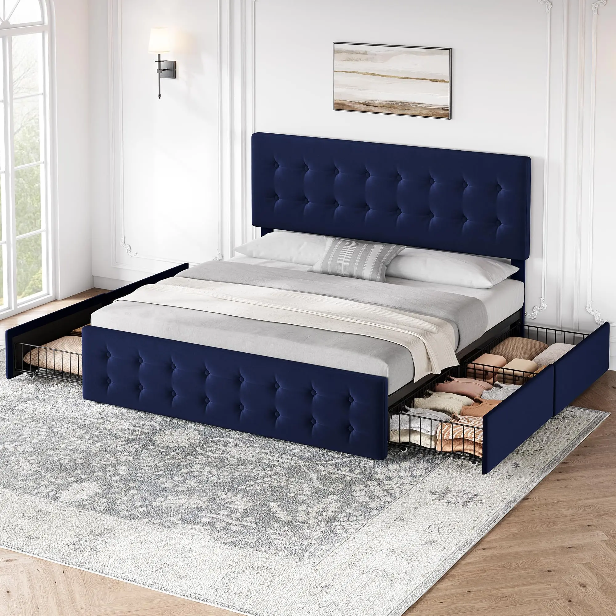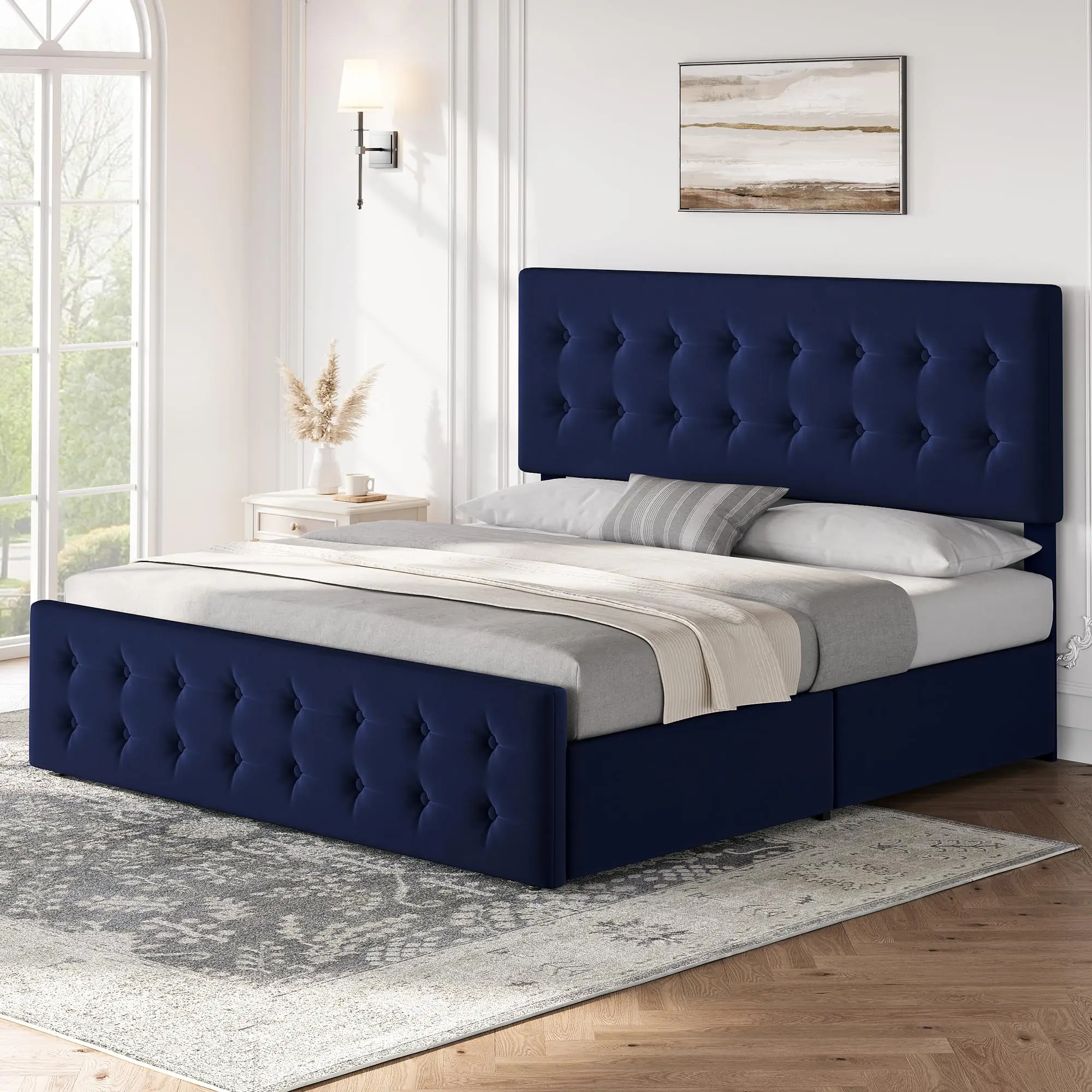 ·【Elegant and Comfortable】 This stylish king size bed frame with storage features velvet and a button-tufted design, adding sophistication to your space. Its soft, comfortable, and easy-to-clean properties ensure both comfort and durability.