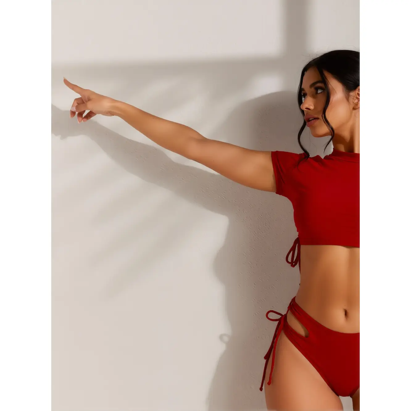 This bikini set is the perfect blend of style and practicality.The short-sleeve crop top adds a modern, sporty touch, while the side-tie cutout bottoms keep the design feminine and on-trend.The adjustable drawstrings ensure a custom fit, so you can feel confident and comfortable from sunrise to sunset.