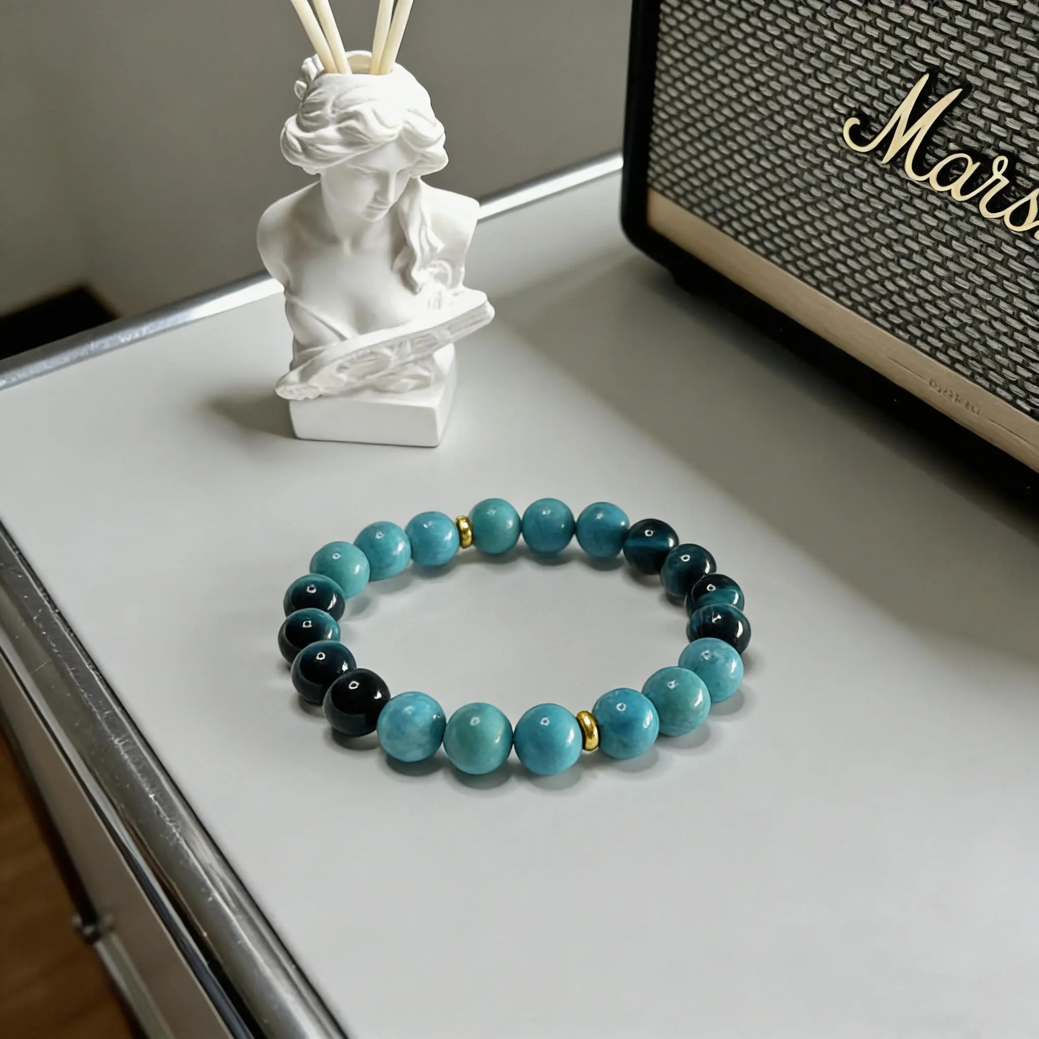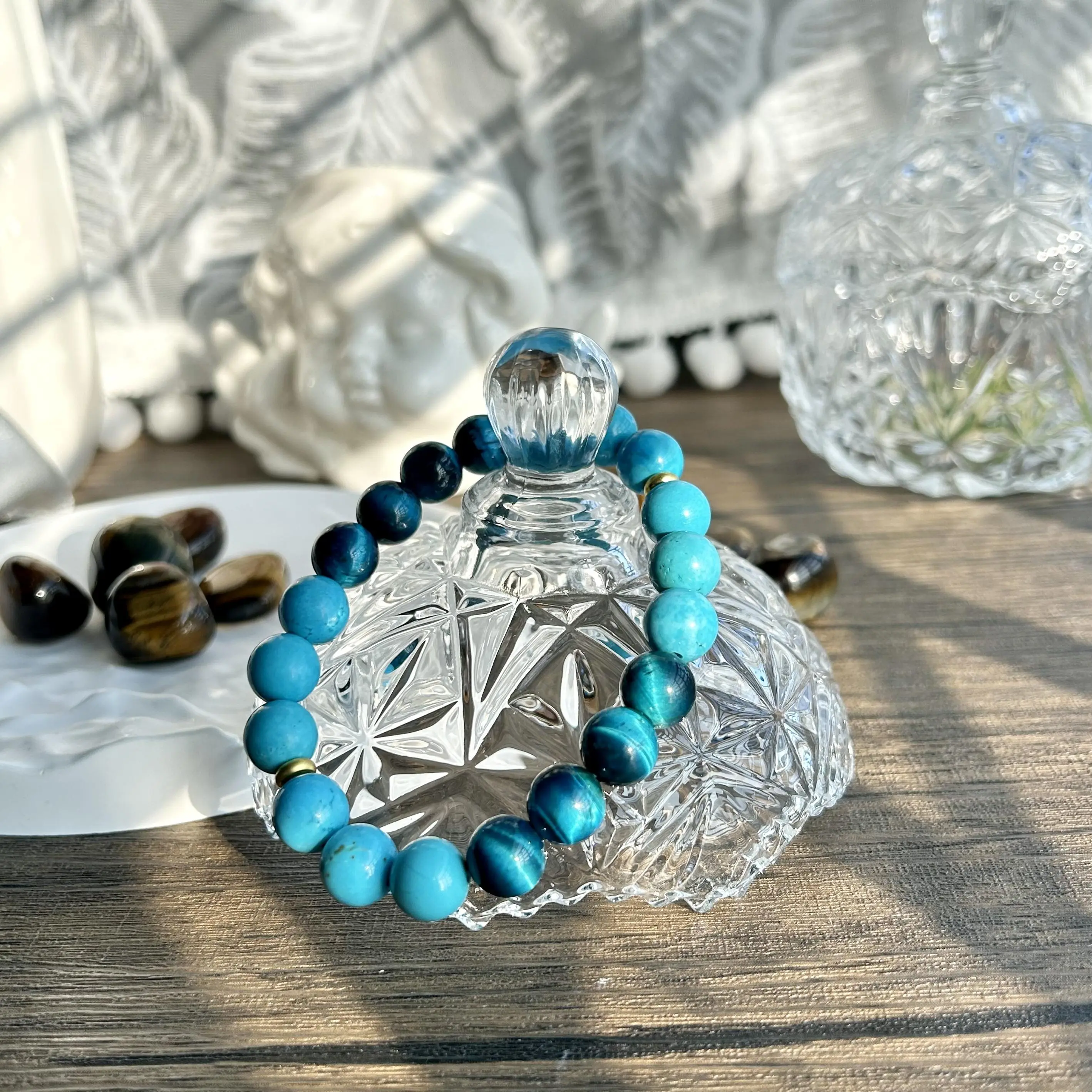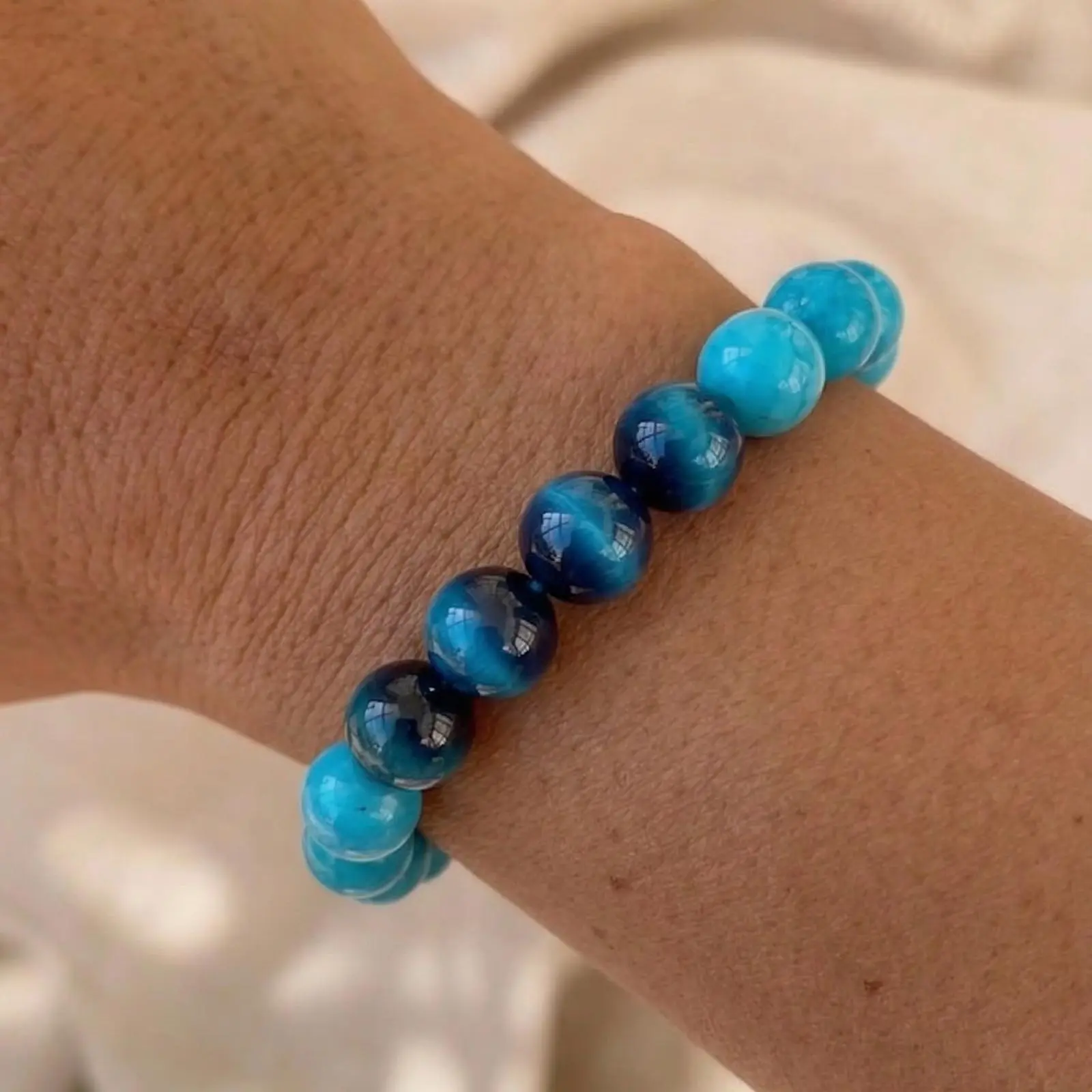 This turquoise and blue tiger’s eye bracelet blends calming energy with quiet strength. The layered shades of blue create a peaceful visual rhythm, helping you slow down, breathe deeper, and reconnect with yourself.