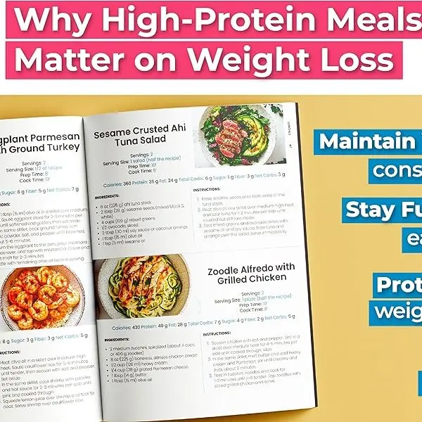 Each page offers a new recipe, ensuring variety and excitement in your meals. The cookbook is tailored for those looking to maintain a high protein intake. With these recipes, you'll enjoy delicious meals that aid in weight loss. No more boring meals; this cookbook brings flavor and nutrition together.