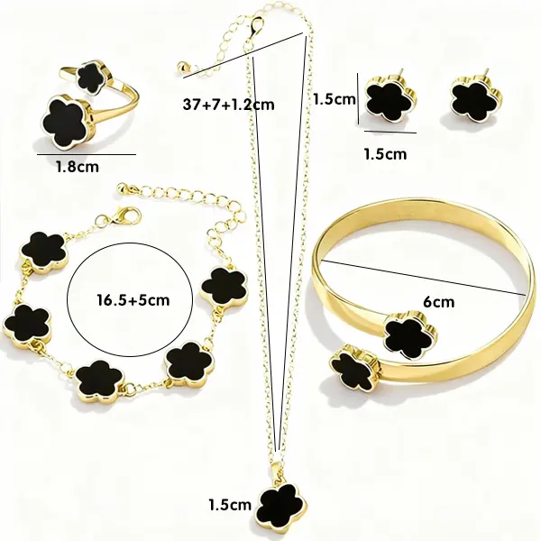 Each piece features an intricate black floral pattern, symbolizing good fortune and happiness. The elegant contrast between the black flower motif and gold-plated chain creates a unique, eye-catching aesthetic. This design stands out from ordinary jewelry sets, adding a touch of luck and beauty to your look.