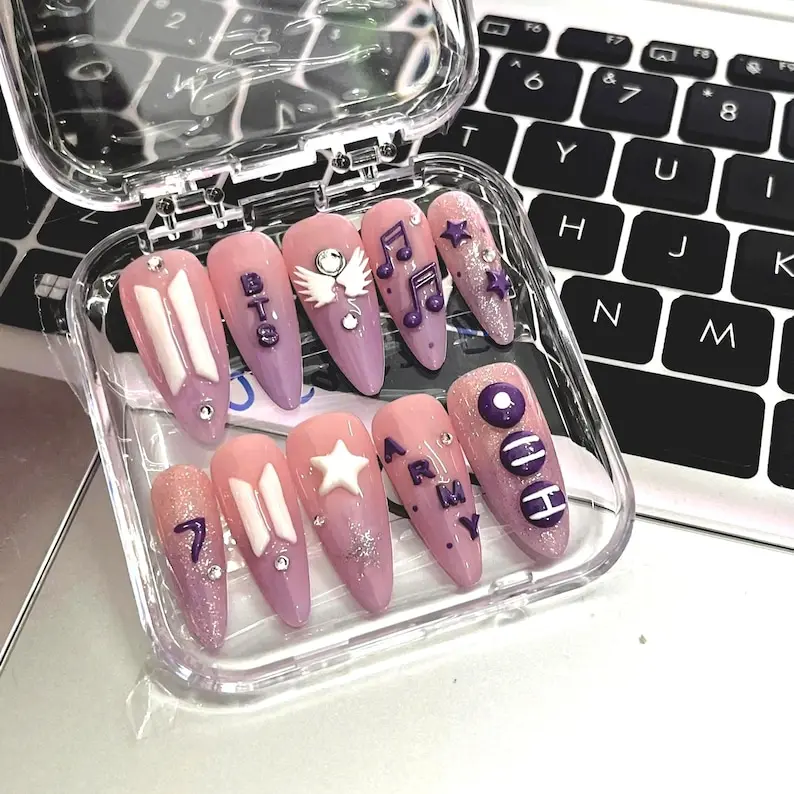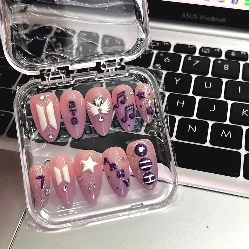 no two sets will ever be exactly the same. maybe a tiny brush stroke is a little different, or a charm sits slightly unique — that’s what makes your set yours only. i always try my best to match the photos as closely as possible, while keeping the beauty of handmade art. when you order from me, you’re not just buying nails… you’re supporting a small artist who truly puts her heart into every set. and that means the world to me.