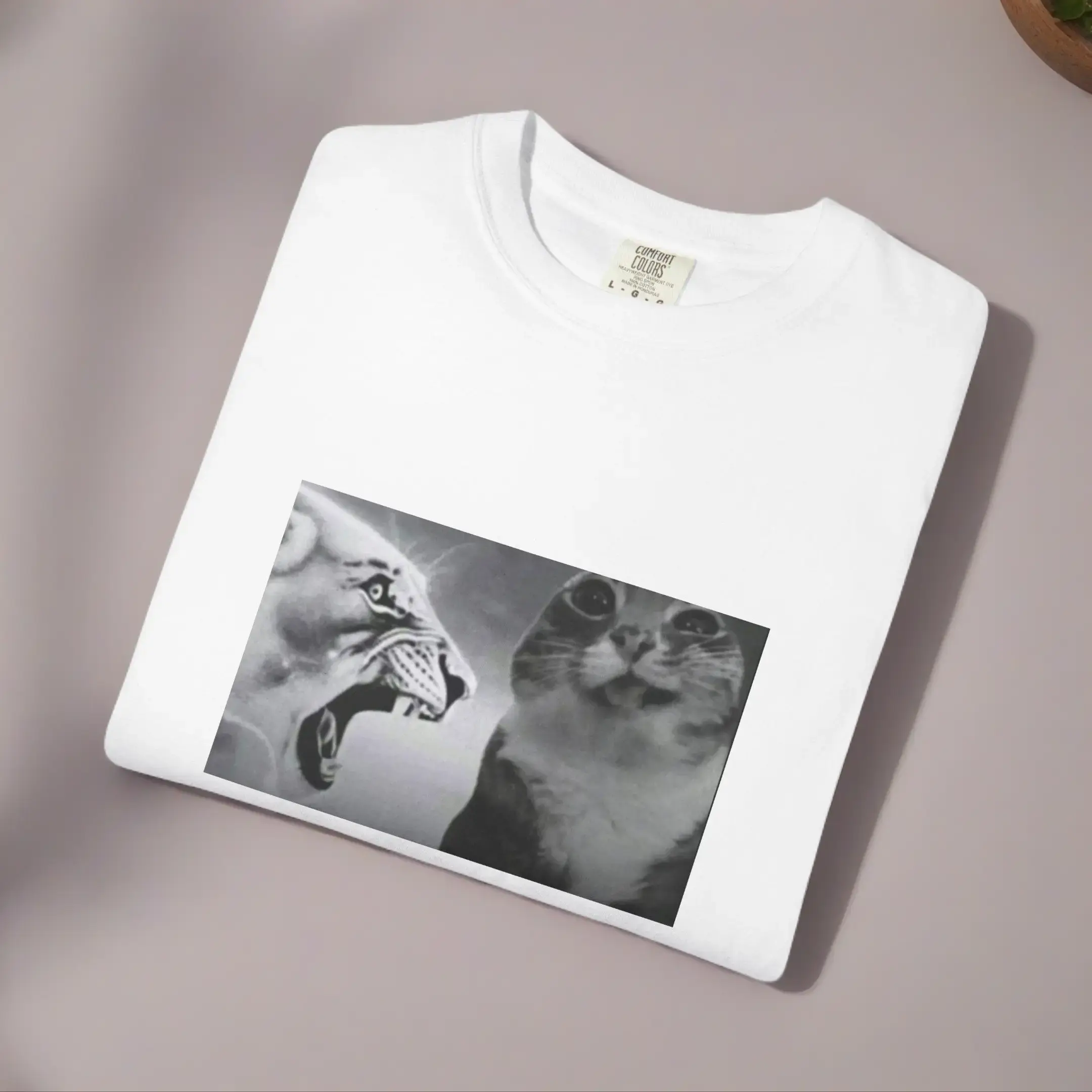 A heavyweight, garment-dyed cotton tee with a bold black-and-white cat photo print that balances attitude and everyday comfort. The relaxed cut and soft, broken-in color from post-construction dyeing give this shirt a lived-in feel straight out of the box. Wear it when you want your outfit to say something—wry, playful, or a little fierce—while staying comfortable during long days, relaxed weekends, or late-night hangouts. The tubular knit and double-needle stitching keep the silhouette clean and durable, and the sewn-in label adds a simple, low-profile finish. Available in a wide range of colors and sizes, this tee moves easily from casual coffee runs to music gigs and cozy nights in with your favorite people (or pets).