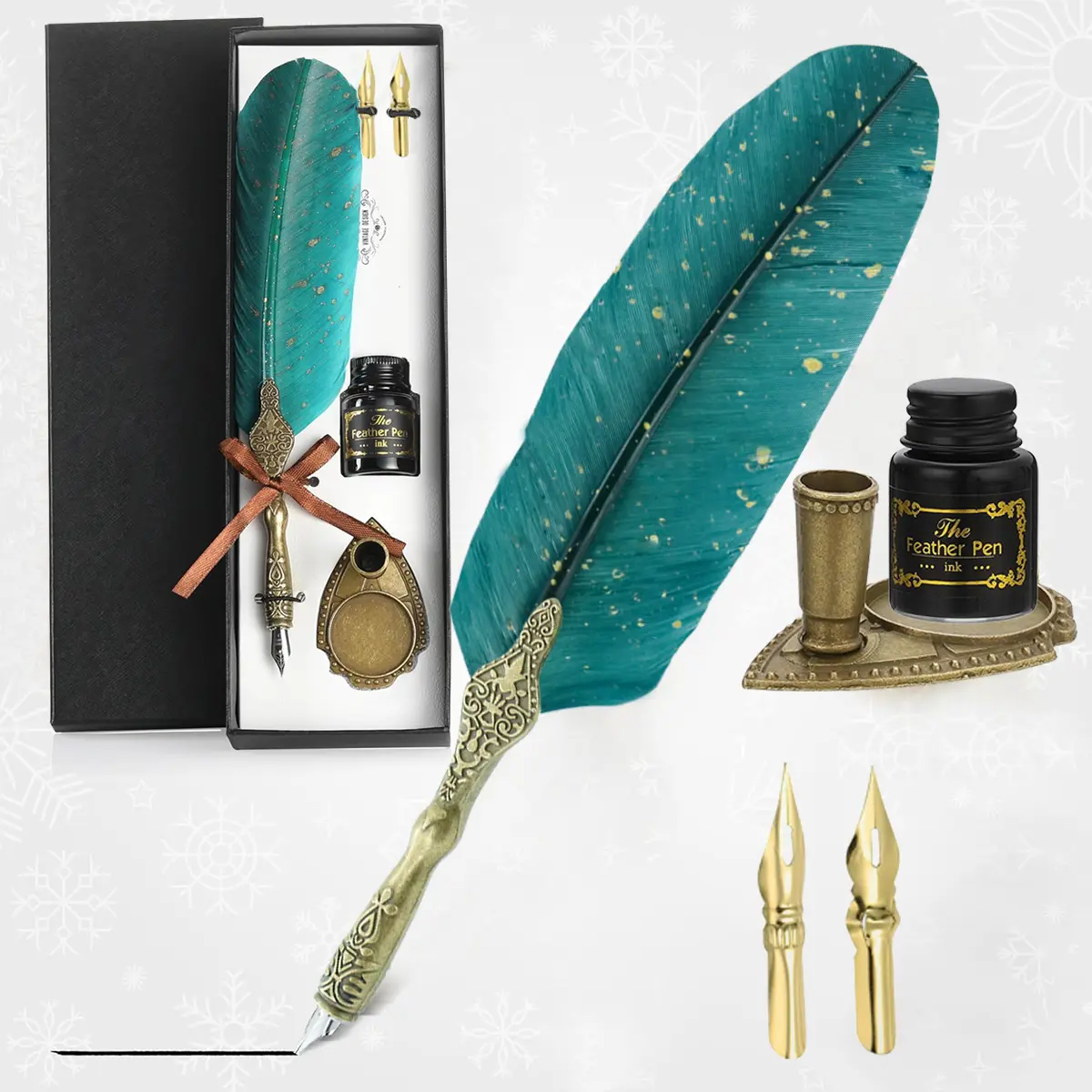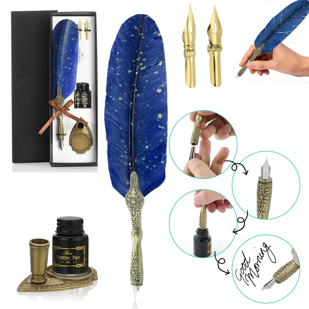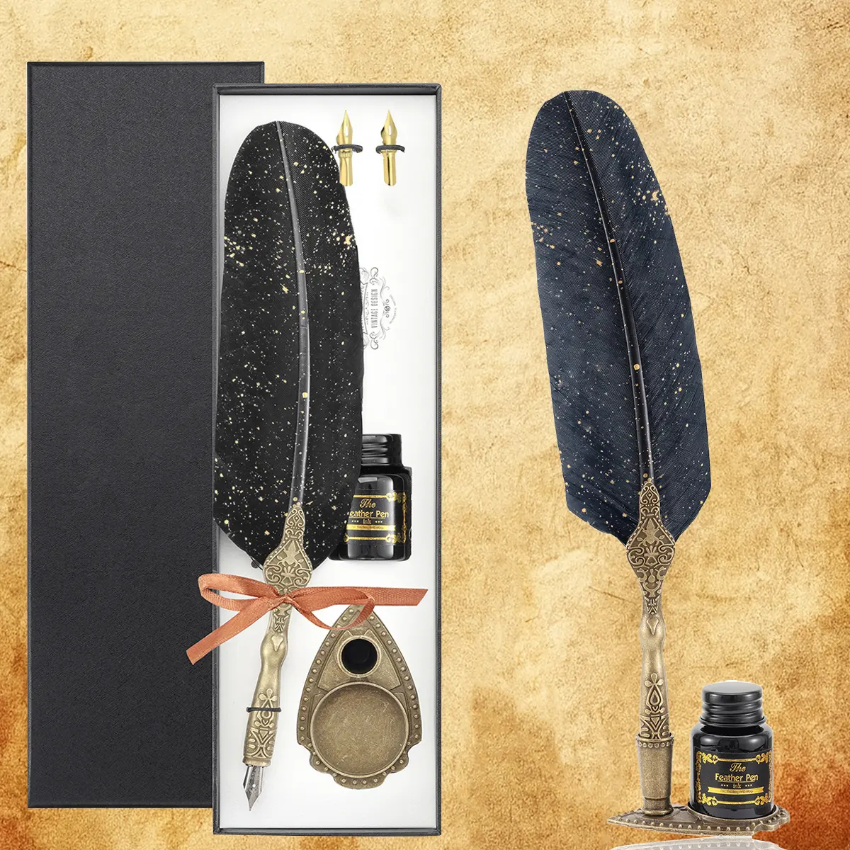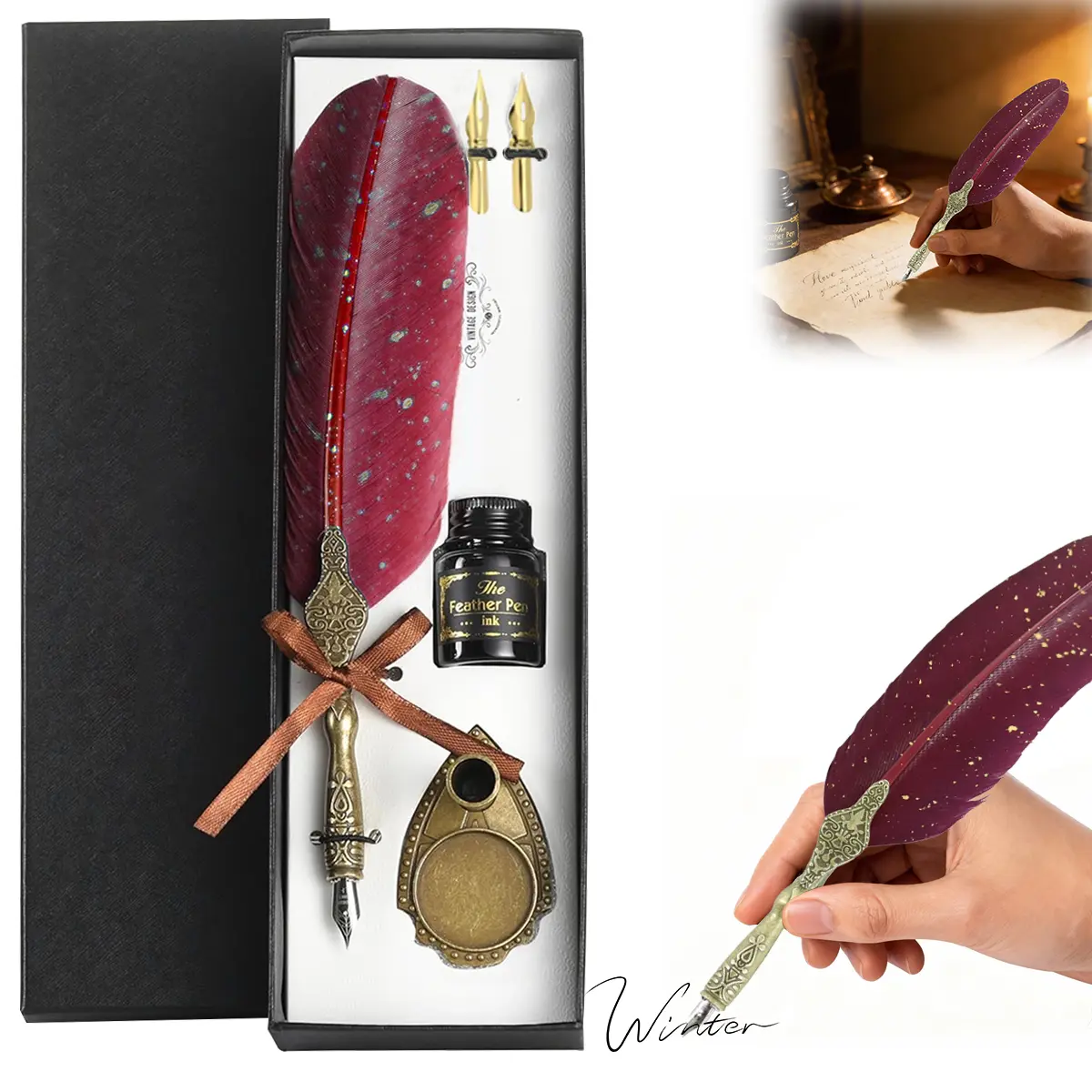 Rediscover the Joy of Writing Escape the digital world and embrace the art of writing with our exquisite feather pen. Its retro design and smooth writing experience reignite creativity, making every word a pleasure. Perfect for those who cherish the tactile joy of writing, this pen invites you to reconnect with the joy of penmanship. Elegant & Handcrafted Each feather is naturally sourced and meticulously adorned with golden powder, creating a stunning, shimmering effect. This pen is a true masterpiece that captivates from every angle. The attention to detail ensures a luxurious writing experience, making it a standout choice for any occasion. Built to Last ⏳ Crafted with a durable metal barrel and nib, this pen is designed for everyday use. The innovative X-shaped ink storage allows 30-60 words per dip, and includes 2 extra nibs for long-lasting use. Experience the reliability and longevity of this beautifully designed pen. A Decorative Masterpiece The stylish shield-shaped pen holder doubles as a decorative piece, adding elegance to your desk, office, or home. It’s more than a pen—it’s a statement of sophistication. Enhance your space with this charming and functional accessory. The Perfect Gift Presented in an elegant gift box, this quill pen is a thoughtful gift for loved ones. Perfect for birthdays, Christmas, or any special occasion. Experience the charm of timeless writing with our feather pen—a blend of artistry, functionality, and elegance!