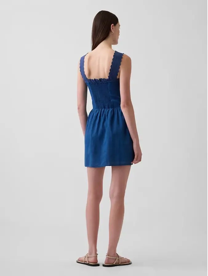 ·Soft linen-blend or indigo cotton voile mini dress.