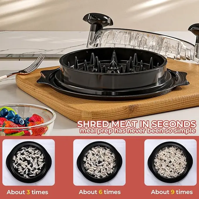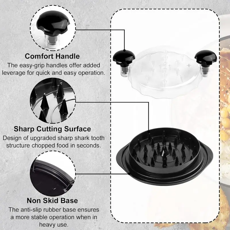 The meat machine builts-in plastic teeth that cover the whole area which can tightly clamp the food, the lid has extra spikes on the edge, which help meat gather the shredded meat in the middle, cutting it evenly. the tool is applied with an ergonomic handle and an anti-slip base, ensuring comfort and easy operation even during heavy use. These updated structure designs can make your cooking tasks more efficient