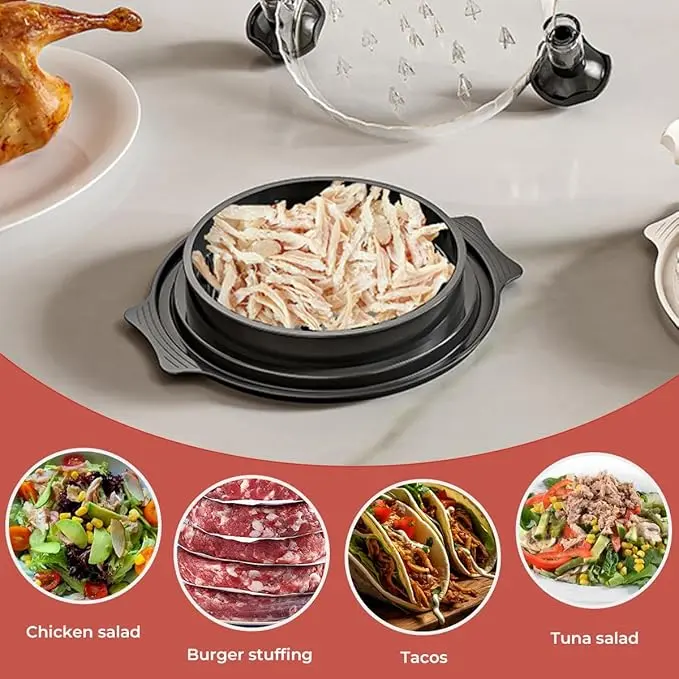 The meat shredder is very suitable for fitness enthusiasts, barbecue lovers, or people who like to cook, it is great for shredding chicken, pork, beef, and other vegetables efficiently, widely applied for enchiladas, tacos, and BBQ pulled pork, tuna salad, buffalo chicken salad, casseroles. Besides, pet lovers can use the meat machine to shred chicken finely for pet food. An ideal gift for your family or friends on any special day