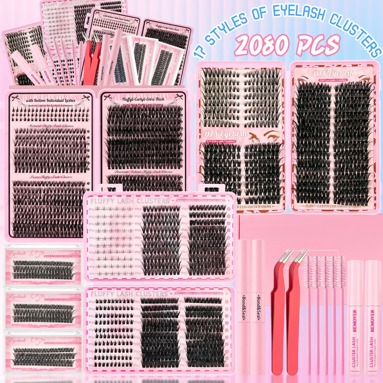 💖 17 Styles, 2080PCS Mixed Lash ClustersGet 17 styles of individual lash clusters with mixed lengths (9-18mm) and densities (40D/60D/80D/100D)! Choose from soft natural wispy, dramatic volume, manga, cat eye, or bottom lashes, all in one convenient kit.