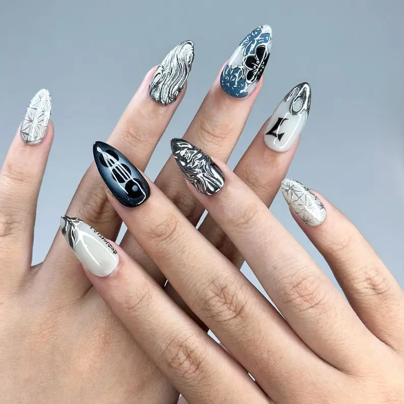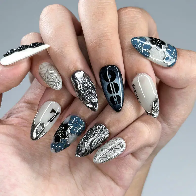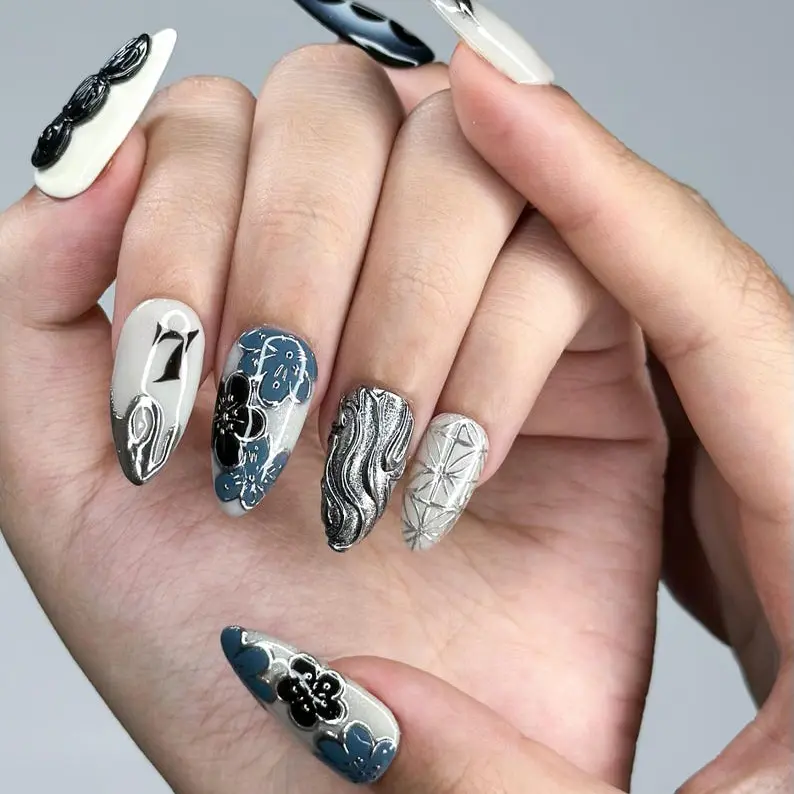 Sarahmarket Korean Aesthetic Silver Blue Press-On Nails, Chrome Texture Floral & Abstract Details, Cool Tone Gradient Base, Minimal Elegant Vibes, Artistic Nail Art, Soft Luxury Look, Custom Handmade Set
