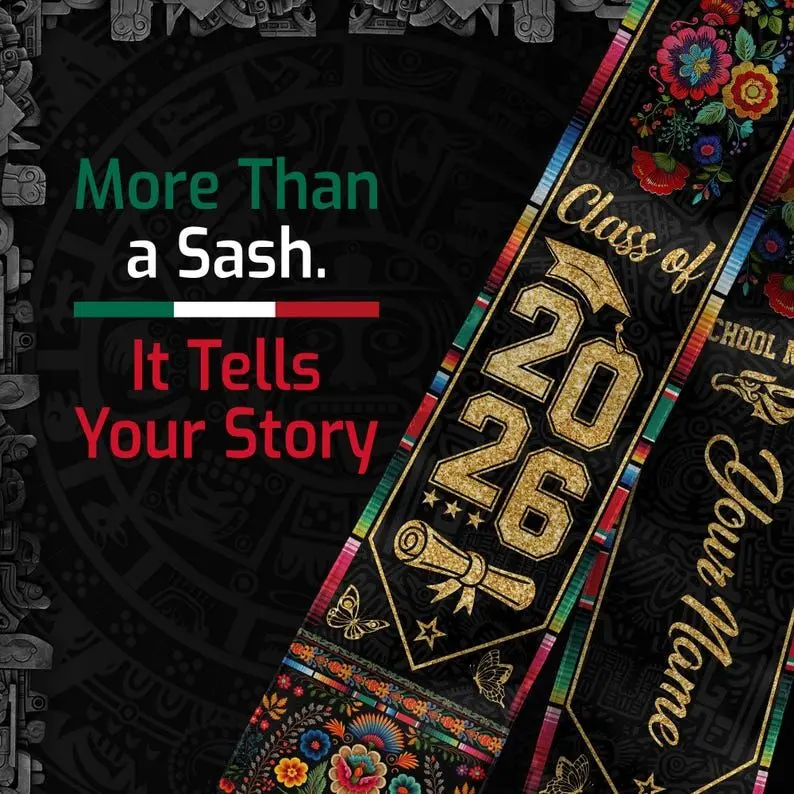 Custom Name & School Mexican Graduation Stole, Mexican Flag Graduation Sash, Mexico Stole Class of 2026, Aztec Pattern Sash Senior Grad Gift Graduation Stole