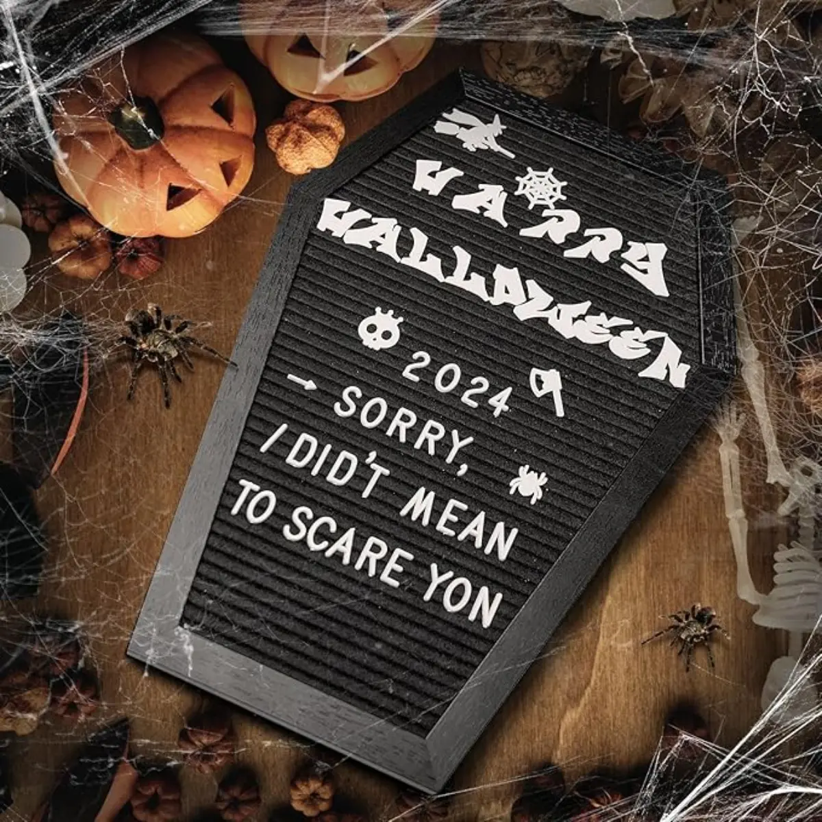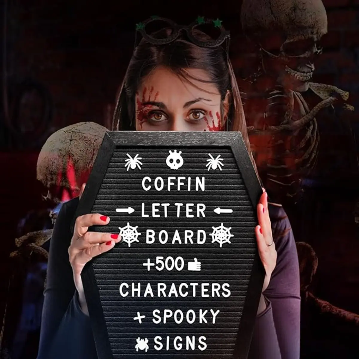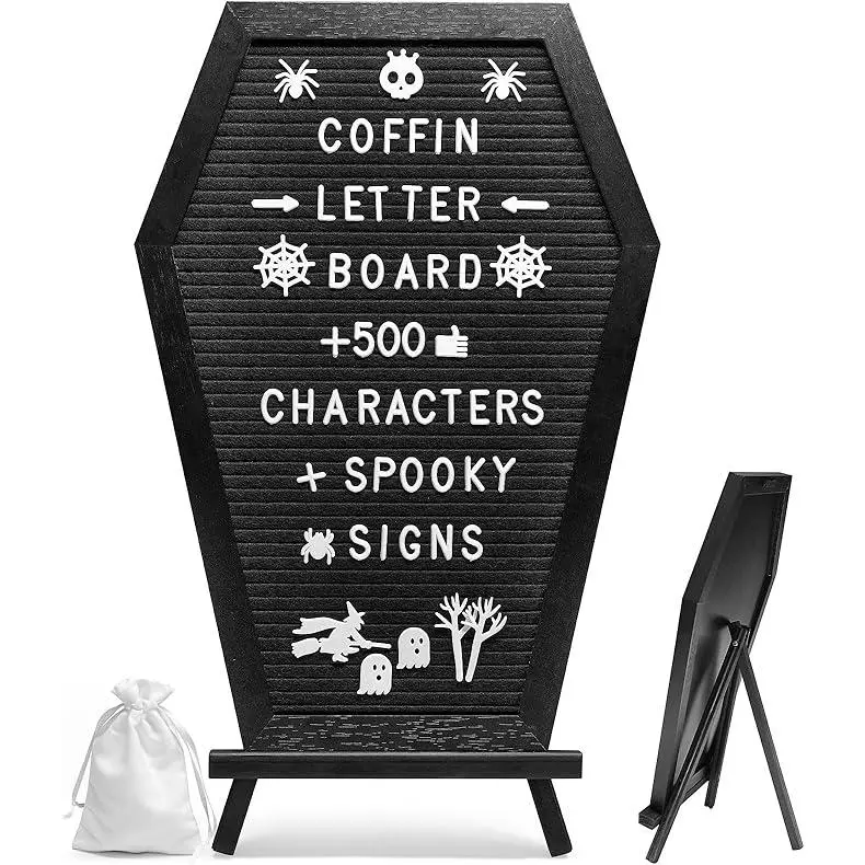 ·- PACKAGE INCLUDES: - PACKAGE INCLUDES: Includes a 16x11 inches felt coffin letter board, 500 characters, a wooden stand and a storage bag ( It can be used to store your favorite characters ). It is a scary and fun gift for friends, coworkers, classmates and Halloween decor.