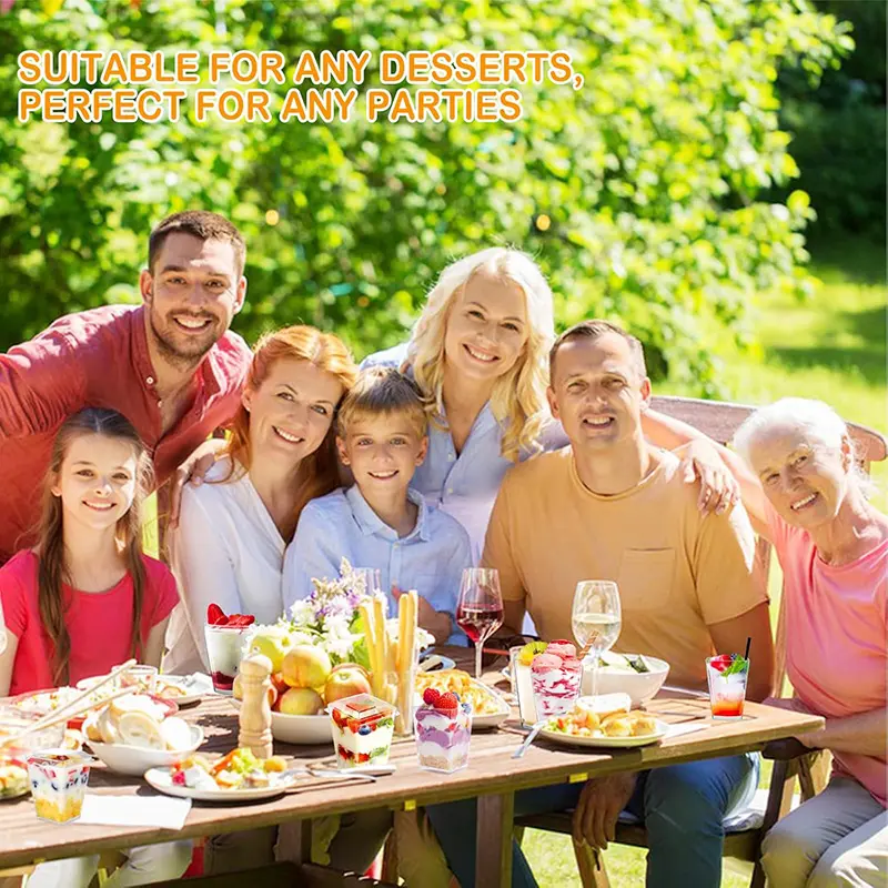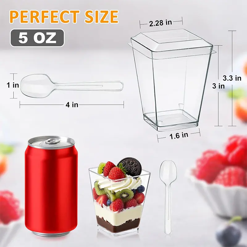 Whether you're hosting a party, organizing an event, or showcasing desserts at a restaurant or retail store, this complete plastic dessert cups set is your perfect choice.Not only does this set fulfill your dessert needs, but it also creates a luxurious and memorable dessert experience.