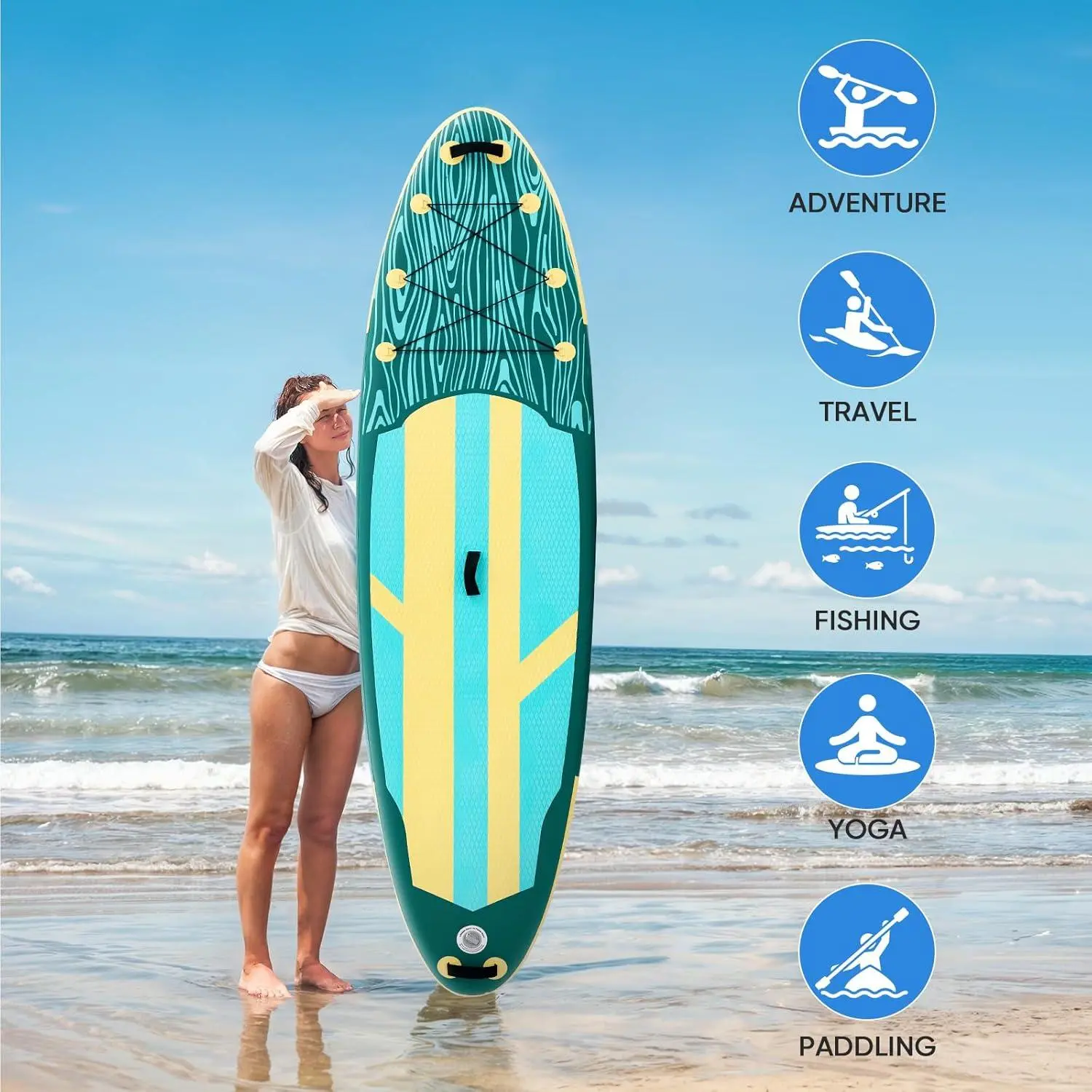 Measuring 125.9 inches long, 32.6 inches wide, and 5.9 inches thick, this 10.5ft inflatable stand up paddle board offers a versatile platform suitable for beginners finding their balance and experienced paddlers looking for a reliable touring board. Whether you are into casual paddling, water hiking, or on-the-water fitness, it adapts seamlessly to lakes, calm rivers, and coastal ocean waters.