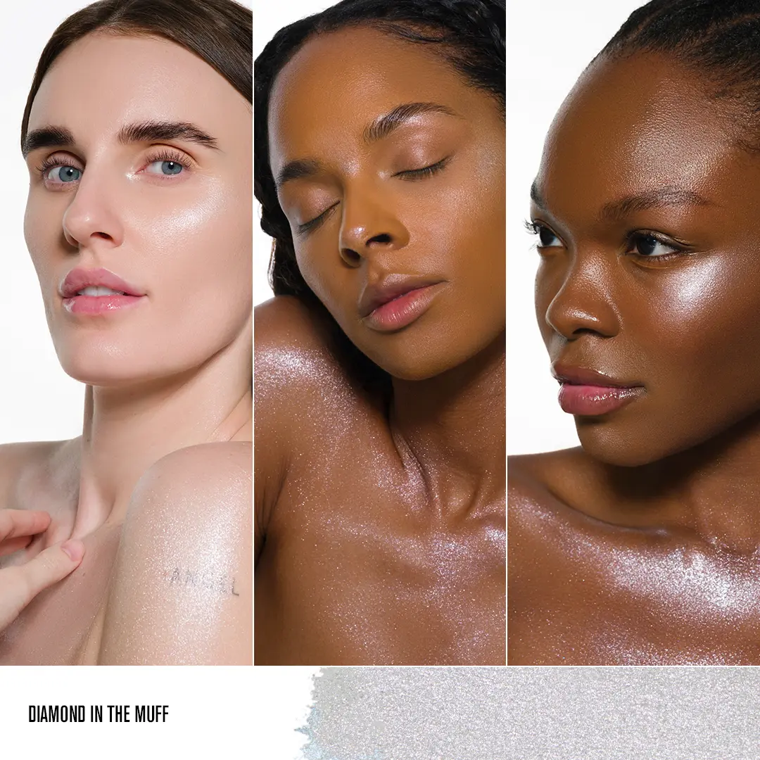 Glimmer Glass (Diamond in the Muff) is a radiant liquid highlighter designed for both face and body, delivering a luminous pearl glow that catches the light from every angle. (Net Weight: 45ML / 1.5 FL. OZ)